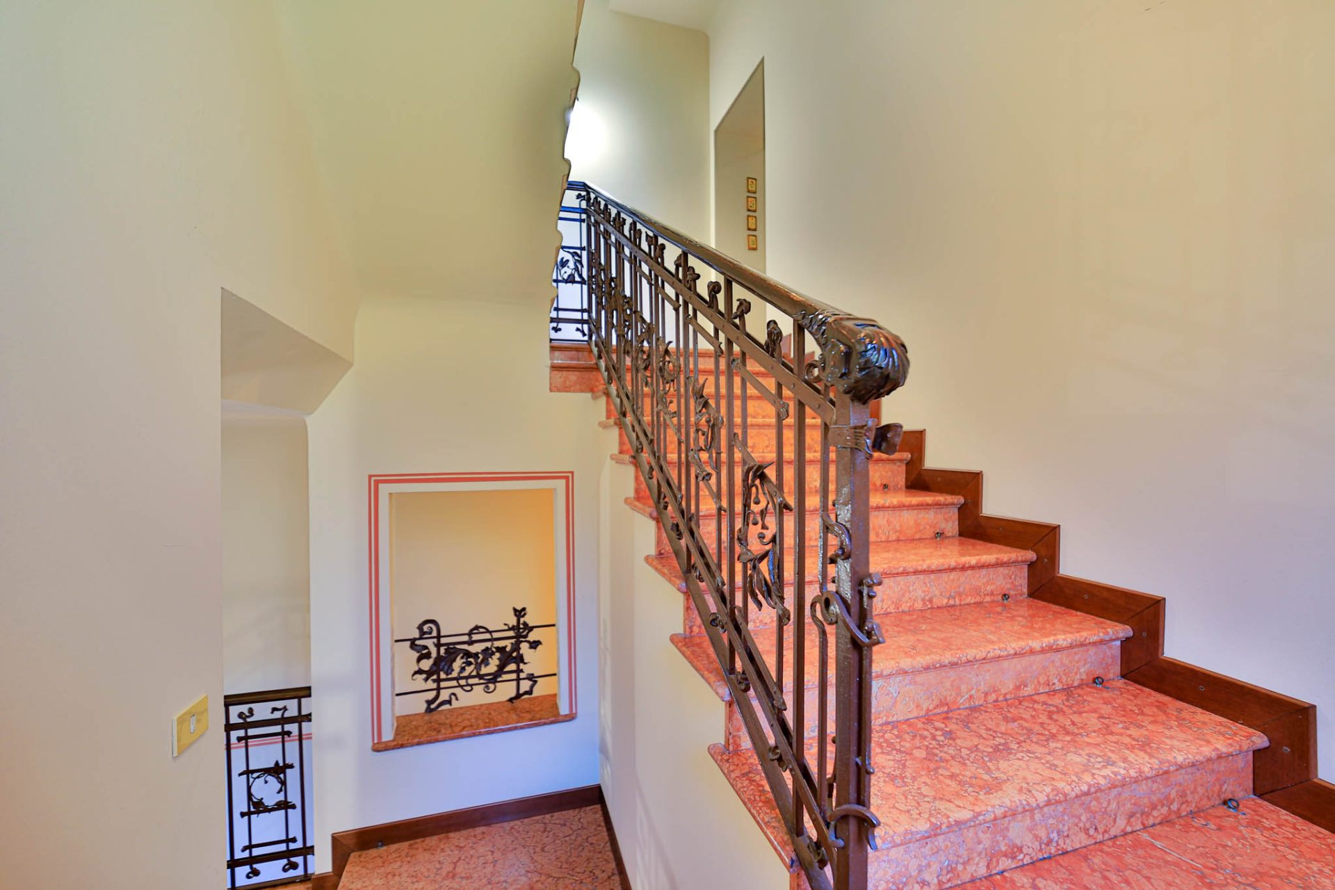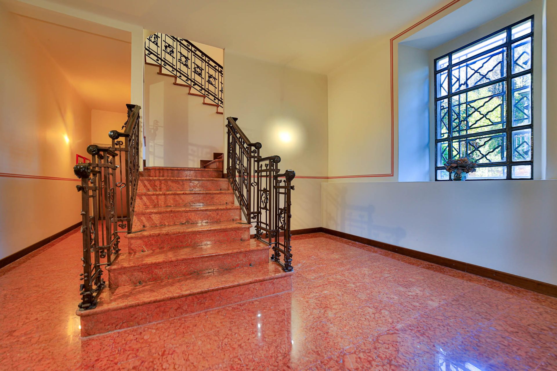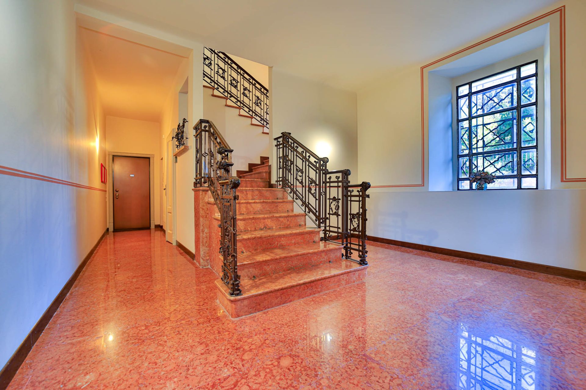 Varcando i cancelli storici si percepisce immediatamente l’anima aristocratica della dimora: l’ampio atrio impreziosito da pavimenti e scale in travertino accoglie con un’eleganza senza tempo, raccontando il prestigio e la storicità del palazzo.
