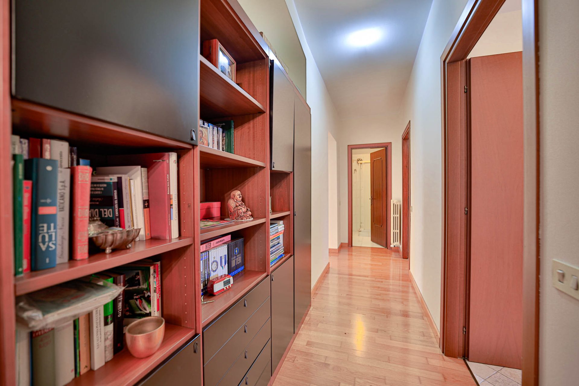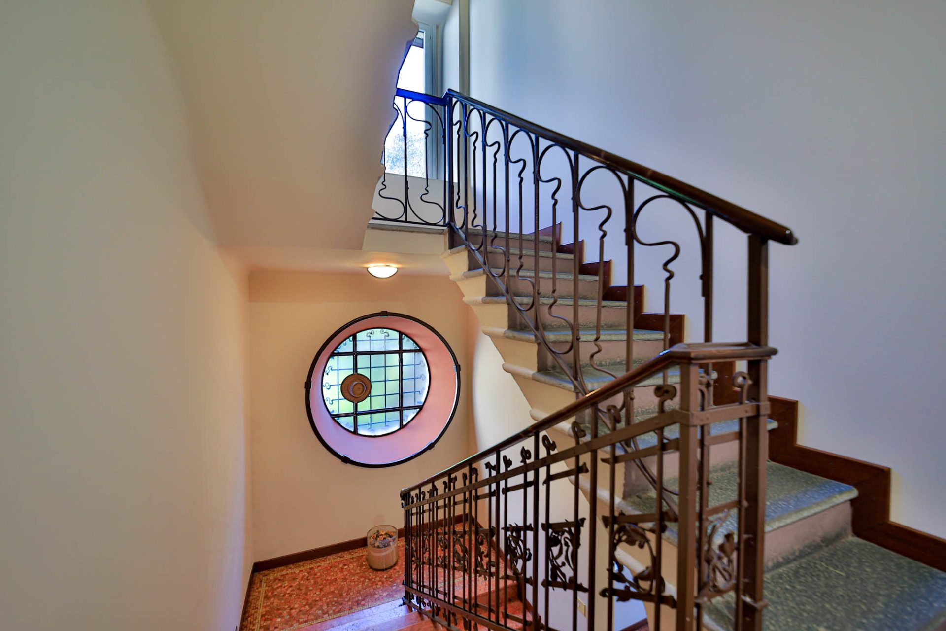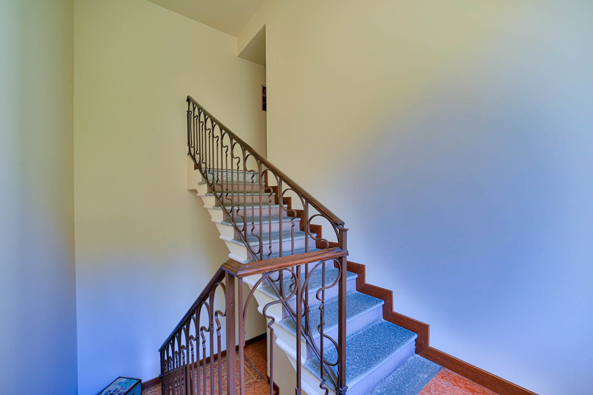 Varcando i cancelli storici si percepisce immediatamente l’anima aristocratica della dimora: l’ampio atrio impreziosito da pavimenti e scale in travertino accoglie con un’eleganza senza tempo, raccontando il prestigio e la storicità del palazzo.