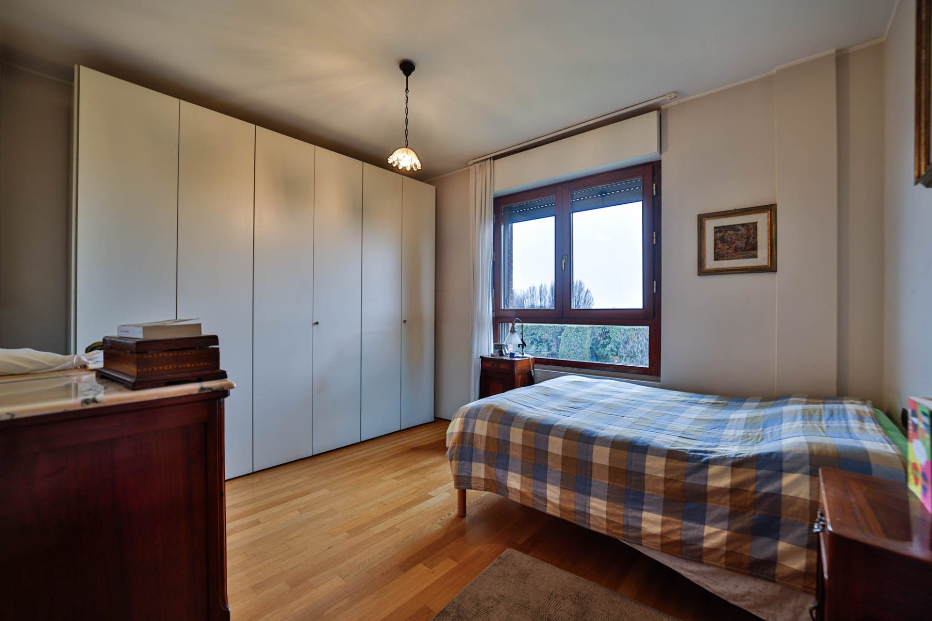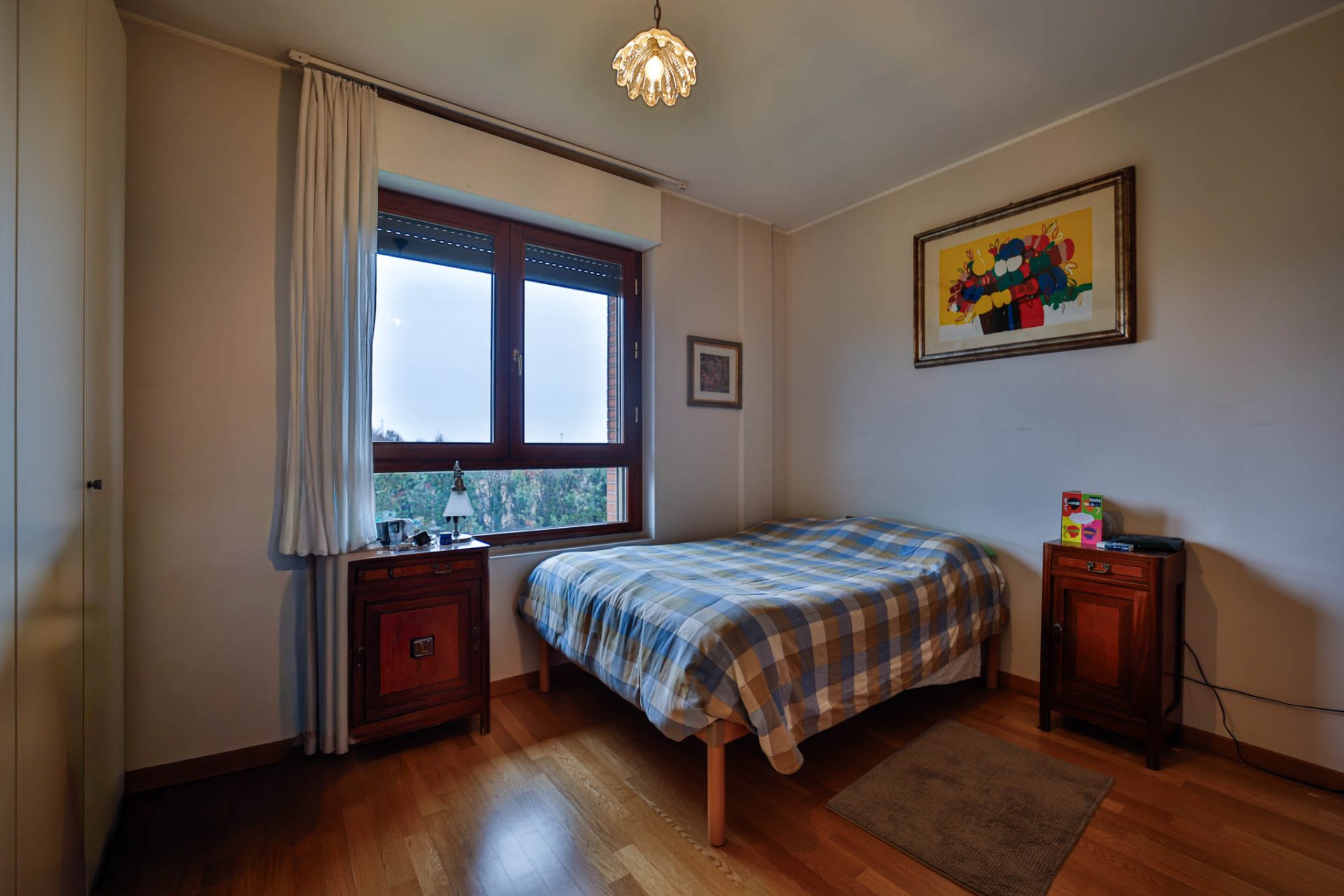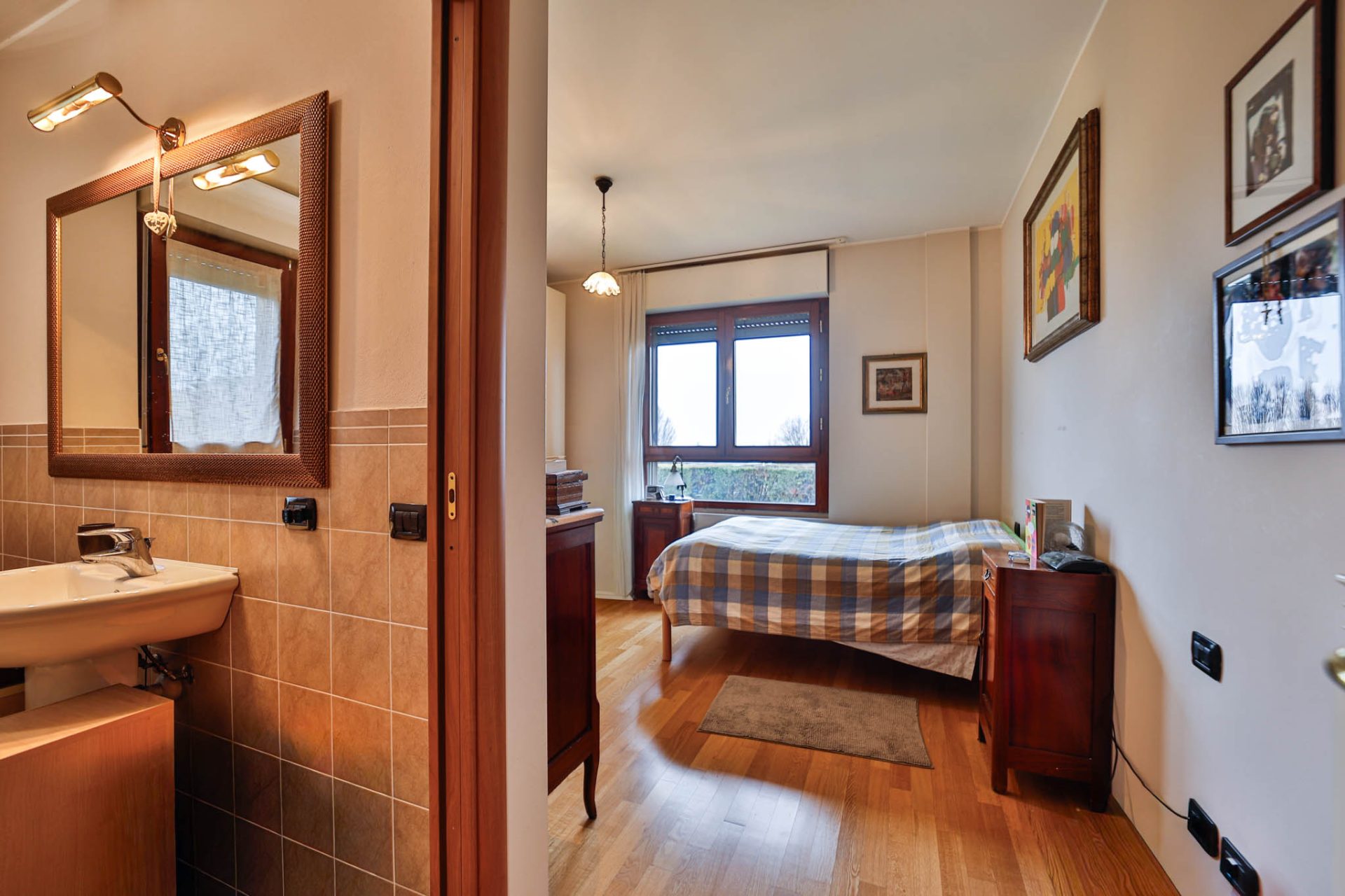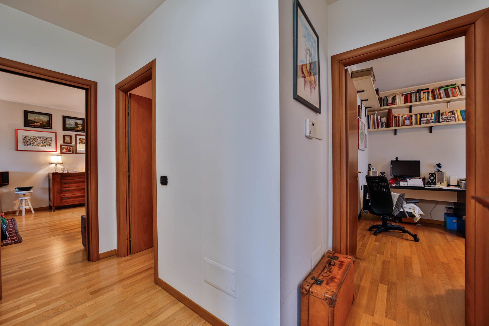 Un comodo disimpegno accompagna alla zona notte, ben separata e organizzata. Qui trovano spazio tre camere da letto, tra cui una matrimoniale con bagno padronale, oltre a un secondo bagno finestrato di servizio. Gli ambienti risultano armoniosi e accoglienti, impreziositi dalla pavimentazione in parquet presente in tutta l’abitazione, ad eccezione della cucina e dei bagni.