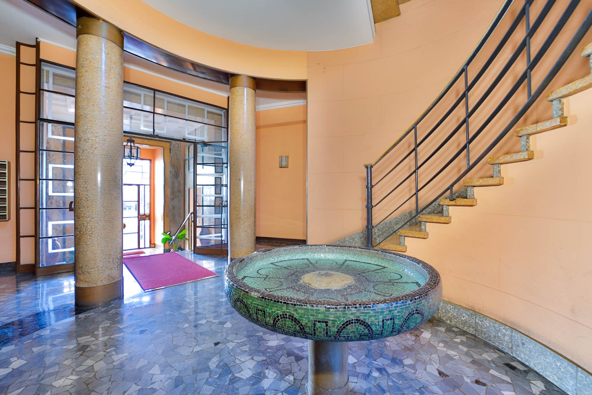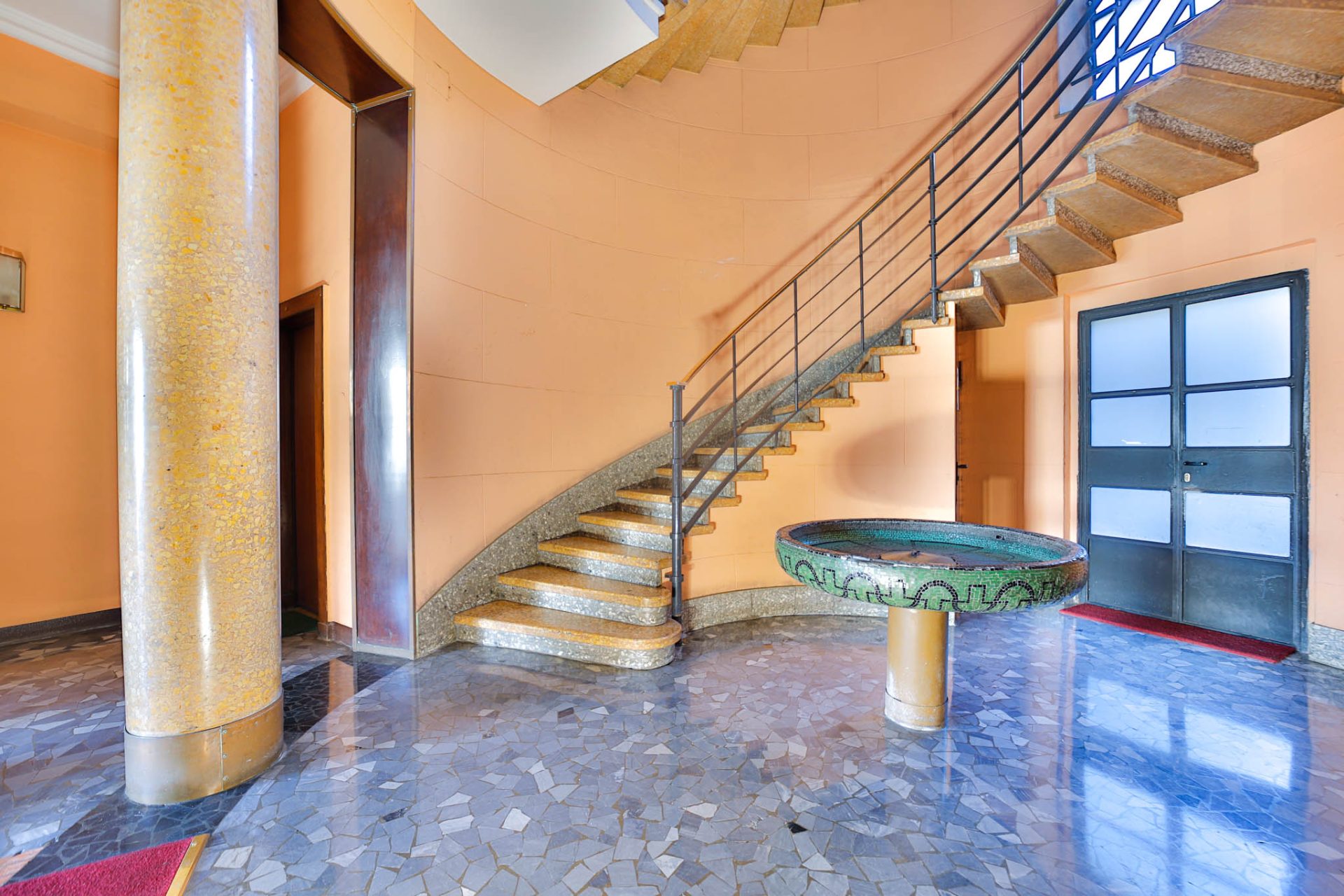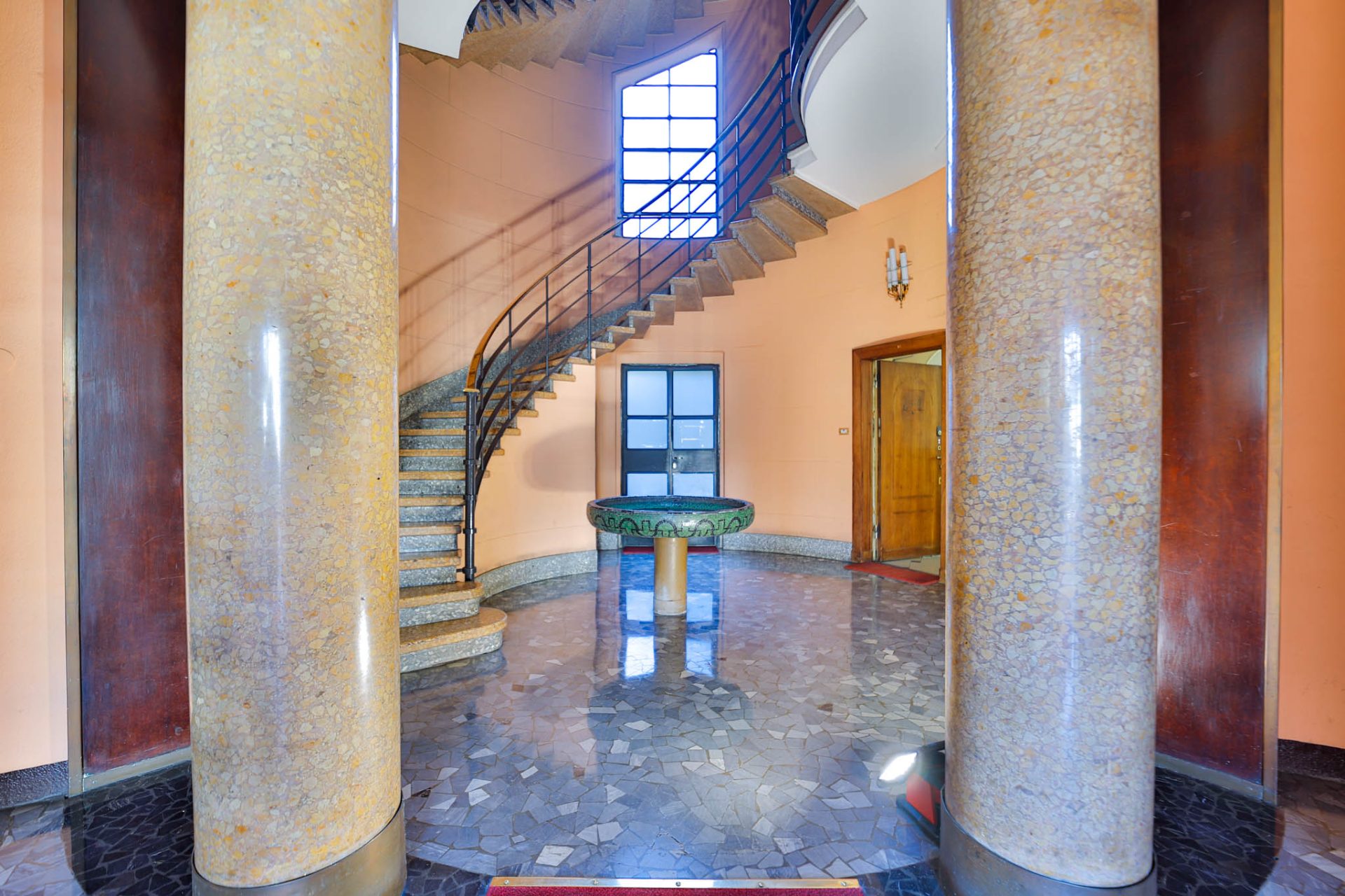 L’edificio si distingue per il suo ingresso di grande rappresentanza, impreziosito da un colonnato in pietra e da una scenografica scala circolare che collega armoniosamente tutti i piani dello stabile, conferendo prestigio e identità all’intero contesto.