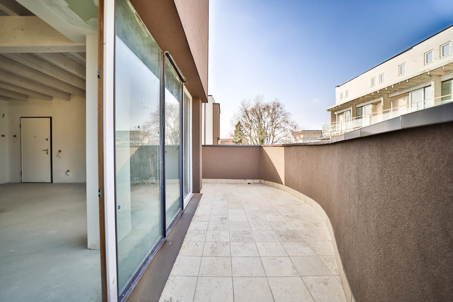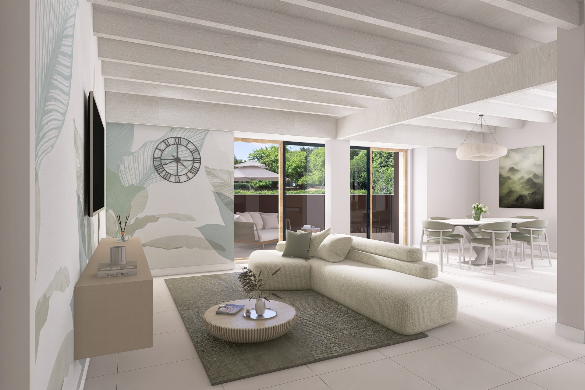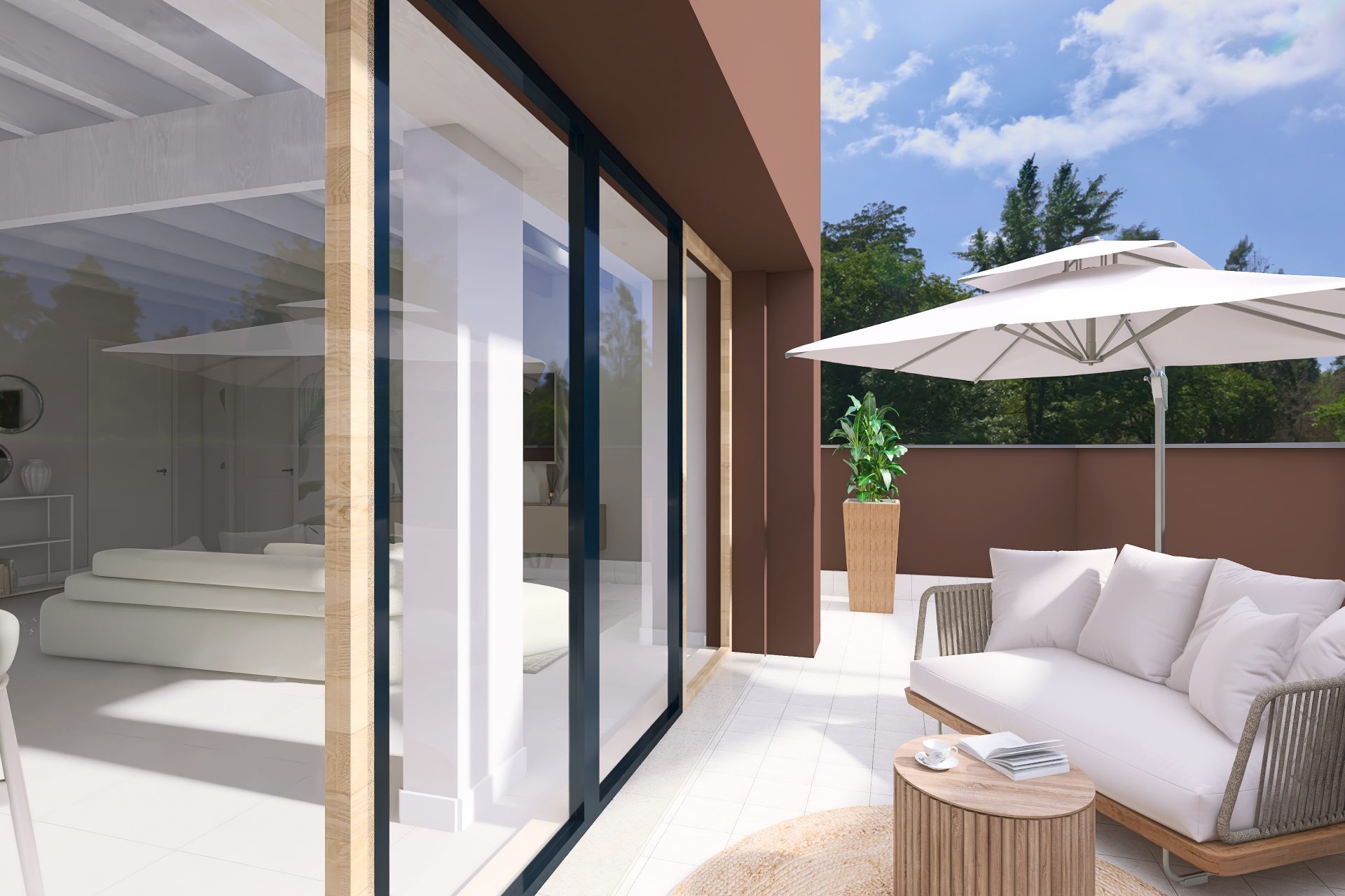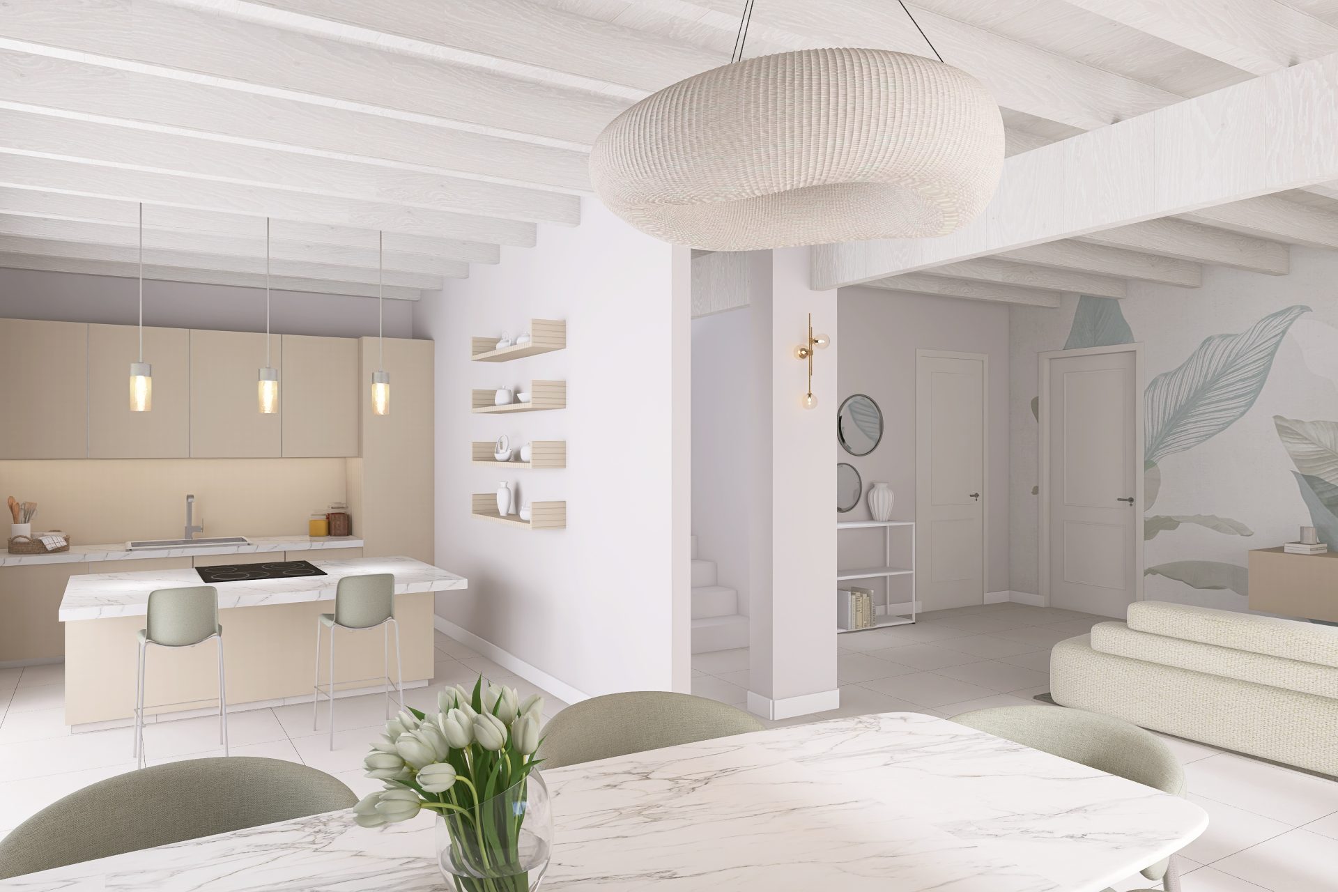 Elemento distintivo della soluzione è la presenza di tre terrazzi, ciascuno con una funzione specifica: un terrazzo a servizio del soggiorno, perfetto per ampliare la zona living, un secondo terrazzo collegato alla cucina, ideale per la quotidianità, e un terzo terrazzo al piano secondo, pensato come solarium riservato, uno spazio intimo da vivere in totale privacy.