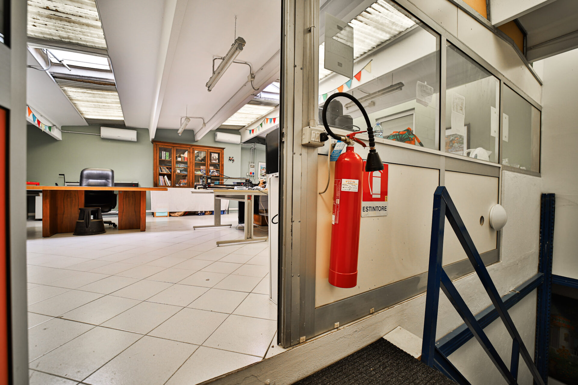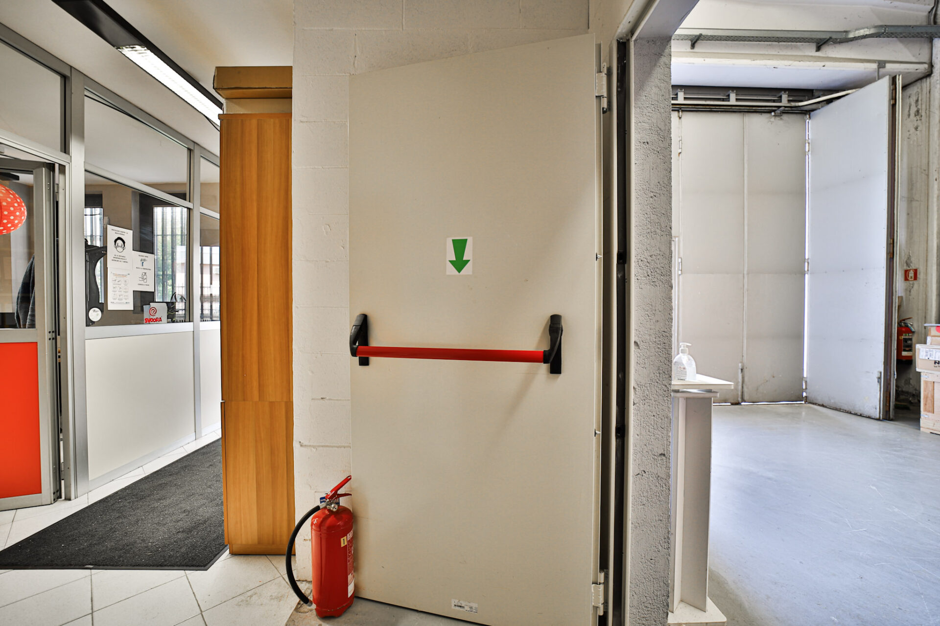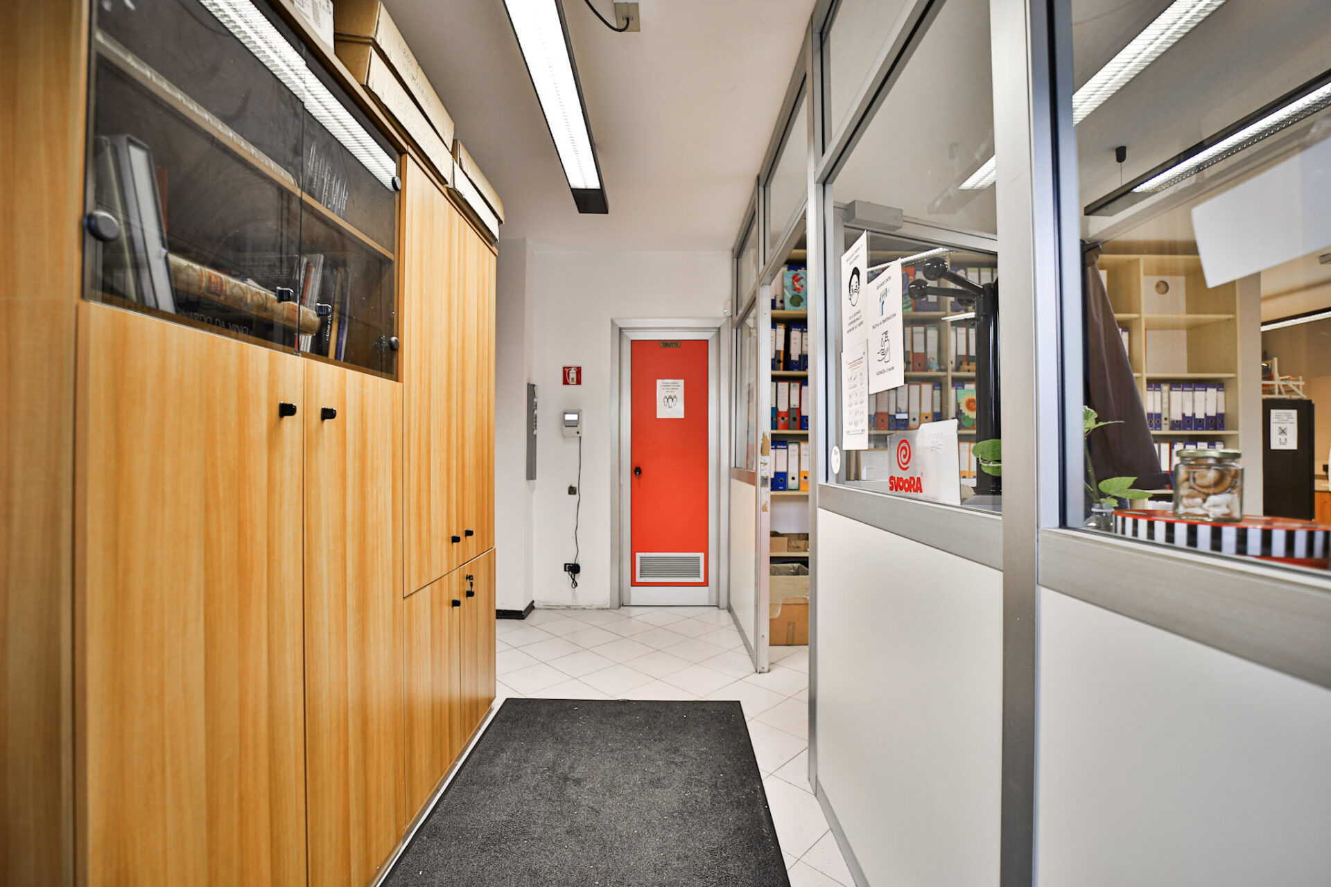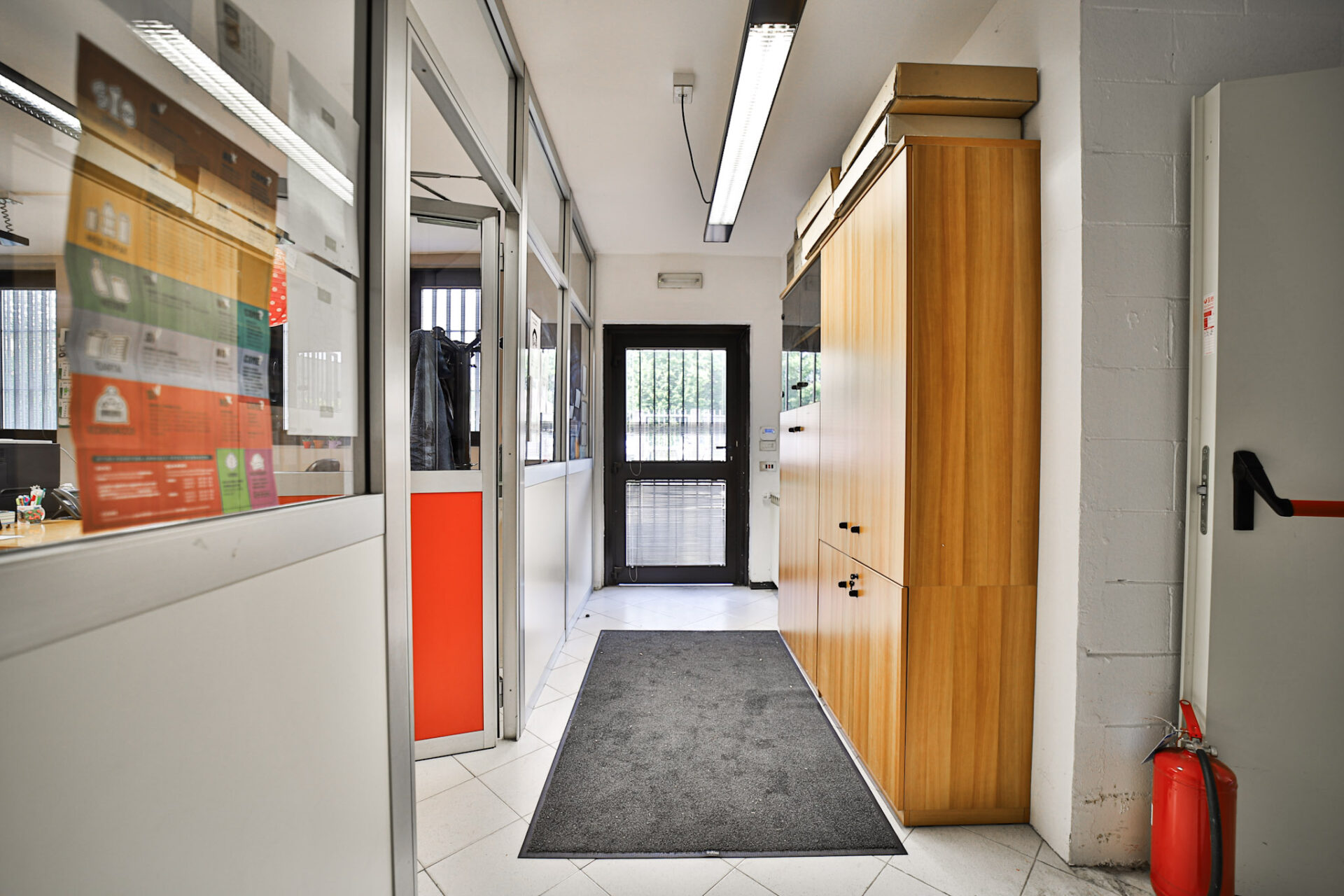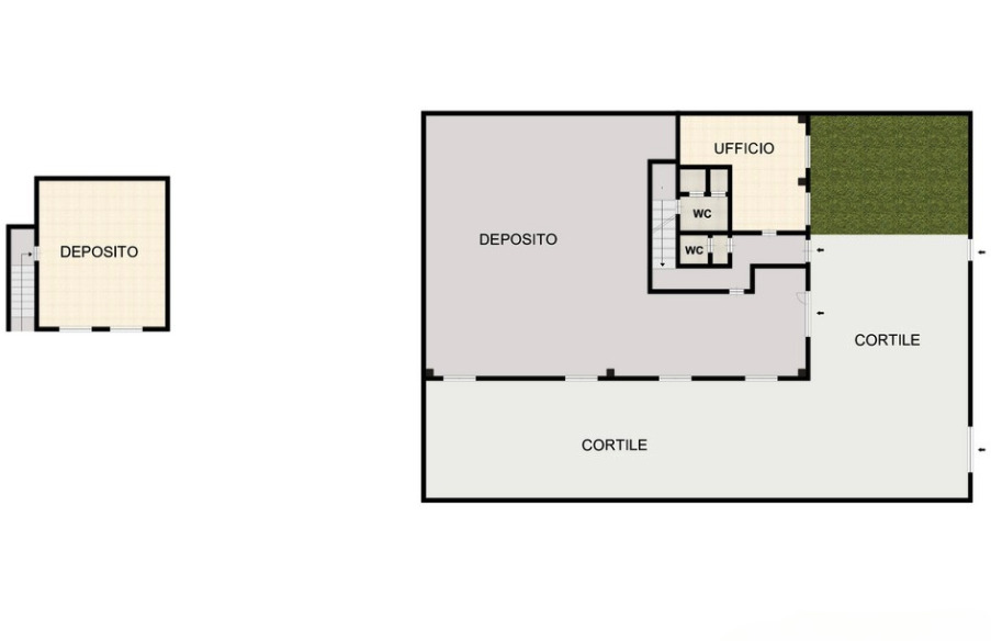 L’immobile si sviluppa al piano terra con un deposito di 273,50 mq dotato di altezza sottotrave pari a 5,90 metri, affiancato da una zona uffici completa di spogliatoio, bagno con doccia e servizio igienico dedicato alla parte direzionale. È presente inoltre un locale archivio, raggiungibile tramite scala interna, mentre l’accesso pedonale separato alla zona uffici garantisce autonomia e riservatezza operativa.