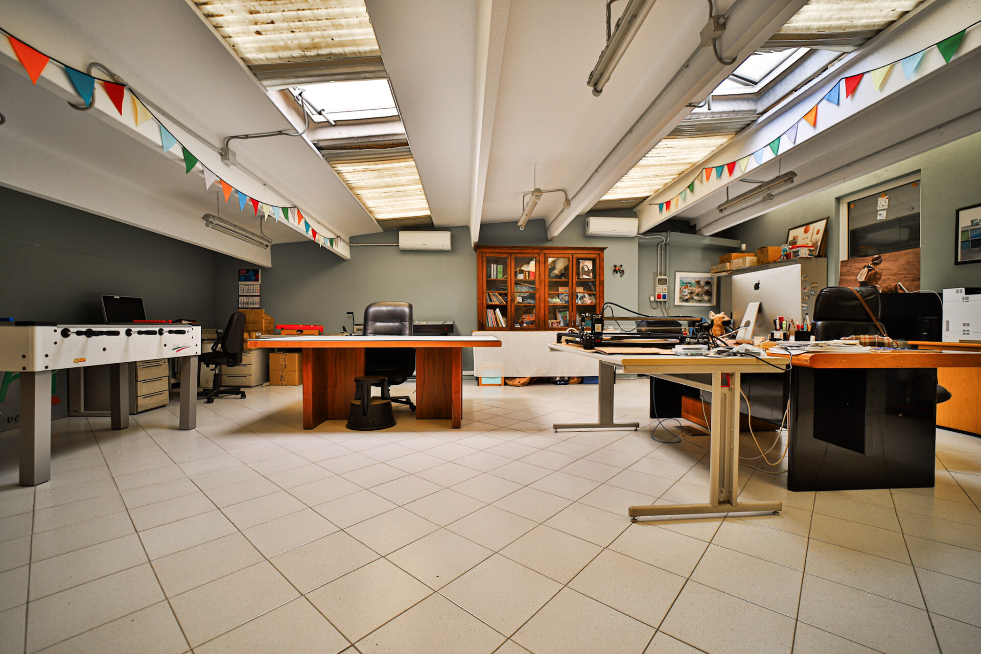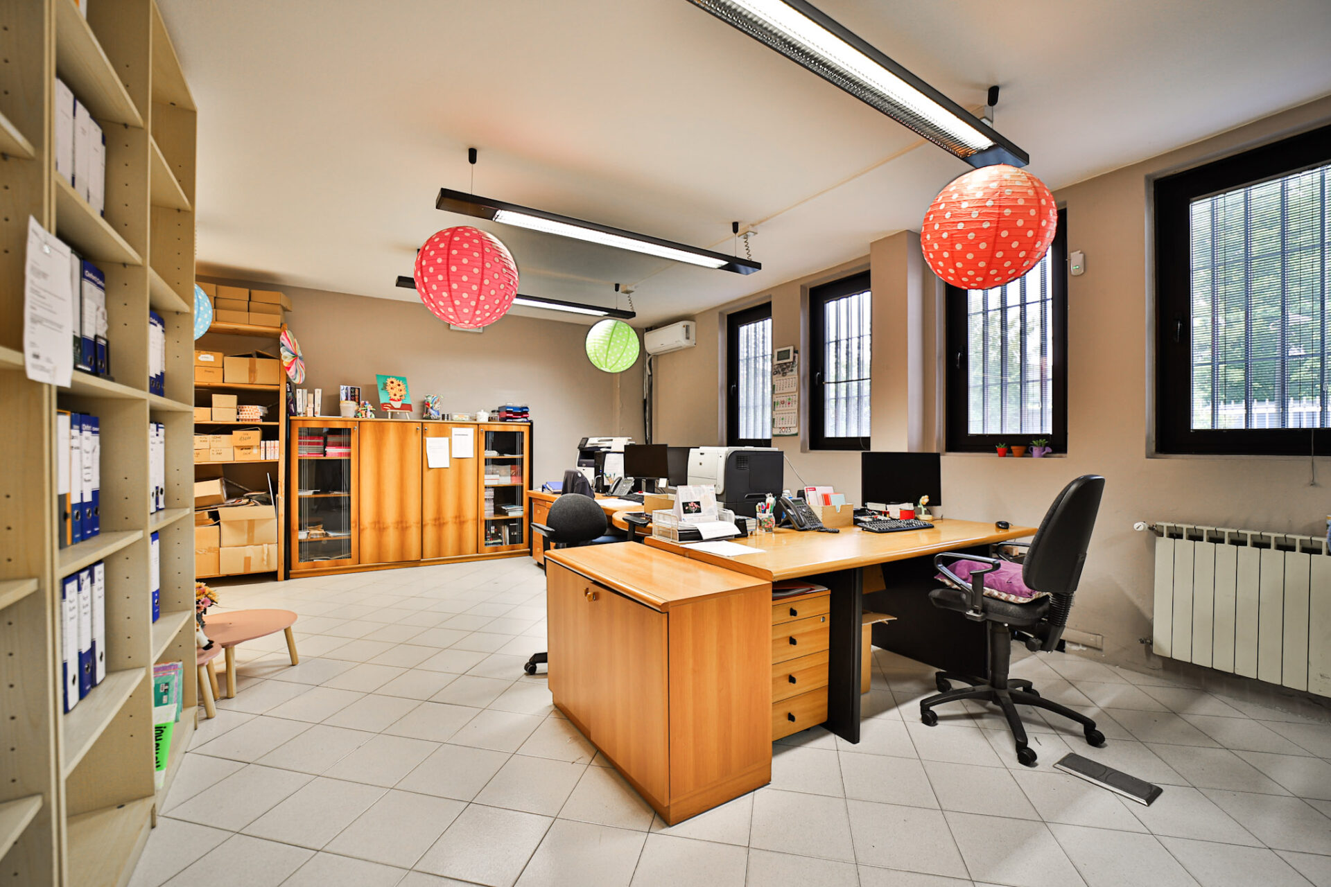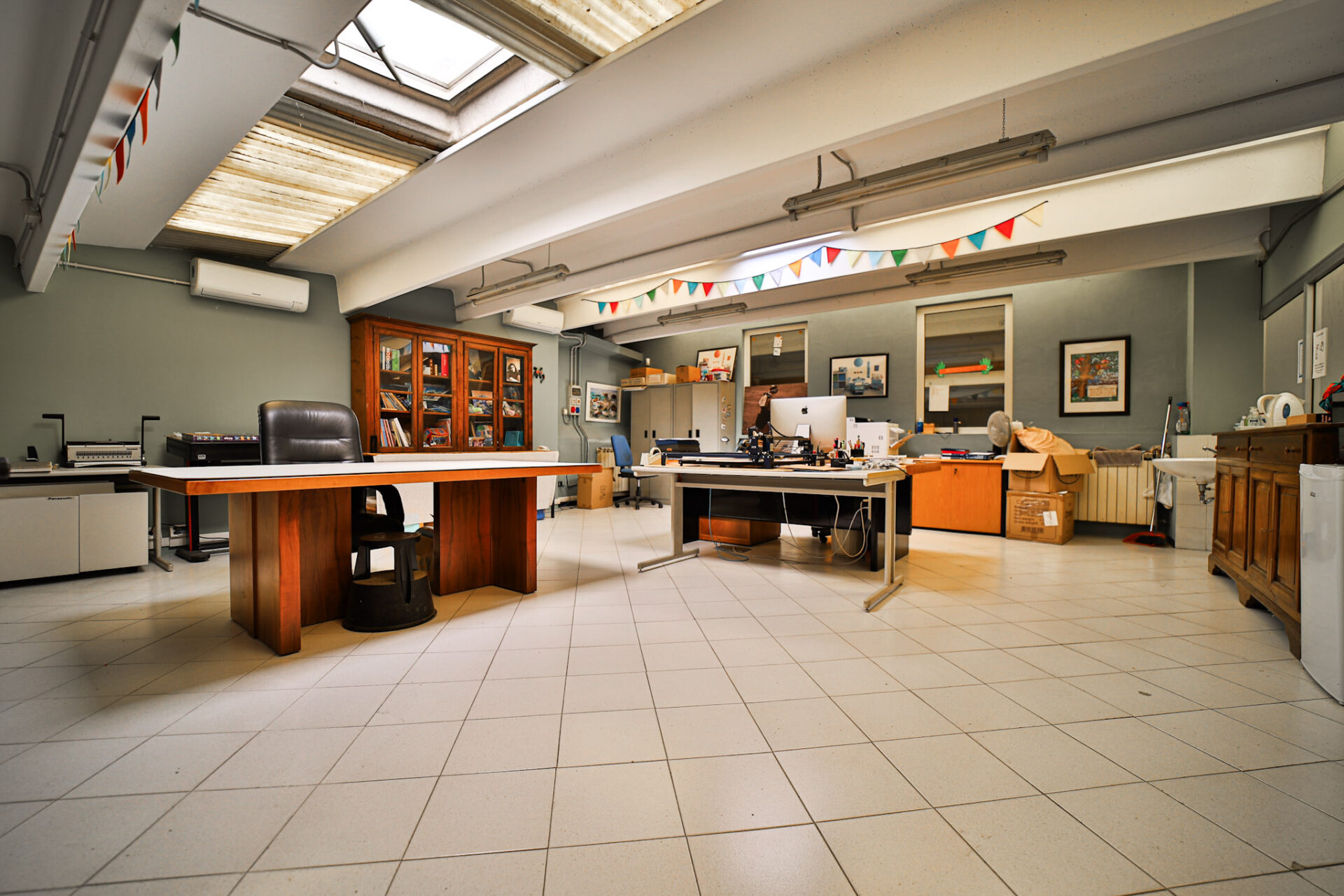 Completano la dotazione: riscaldamento su tutta la superficie, climatizzazione nella zona uffici e archivio, impianto elettrico con fornitura monofase e trifase, impianto di illuminazione su tutta l’area e portone industriale con accesso diretto a un piazzale privato di circa 384 mq, quasi interamente pavimentato, con una piccola area a verde.