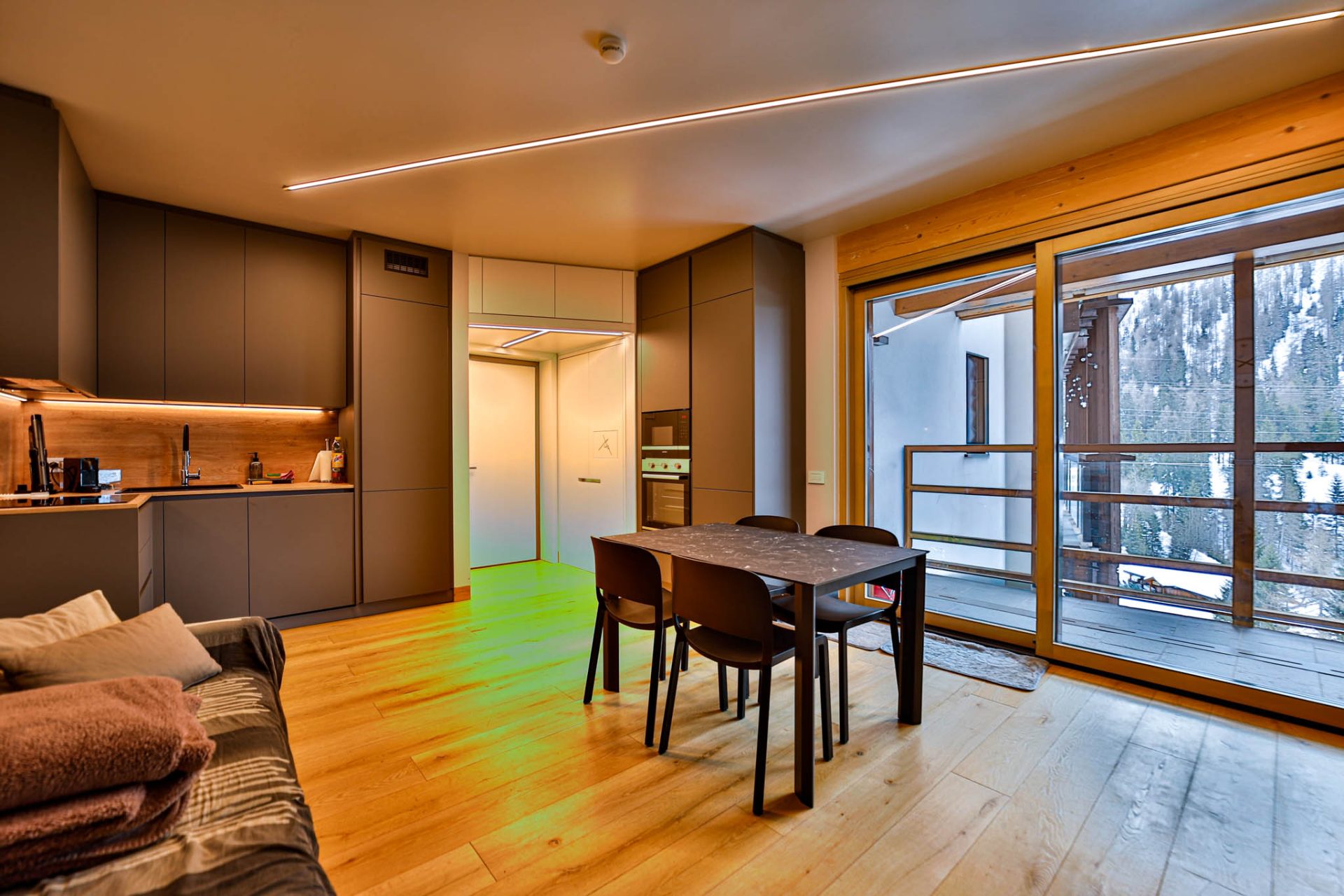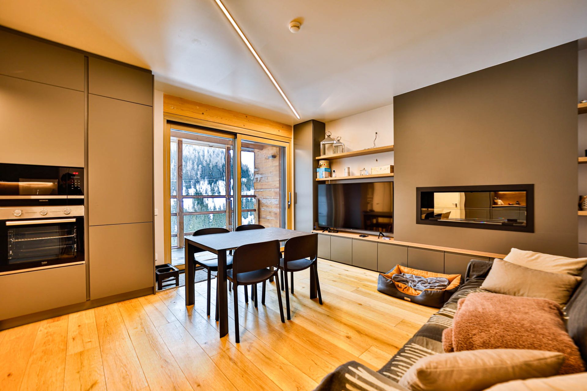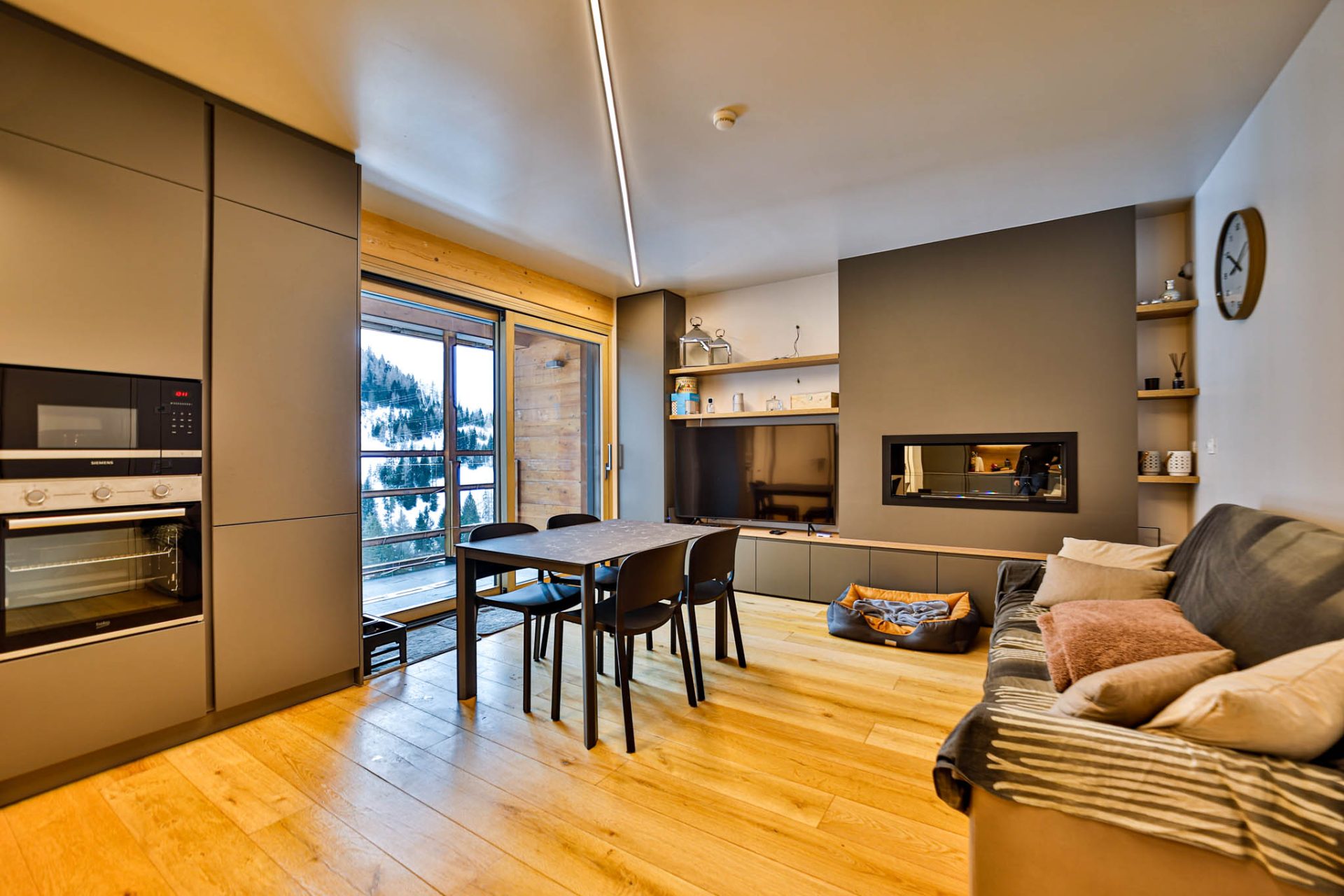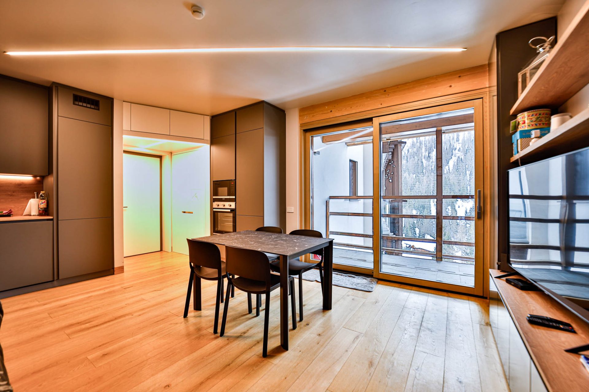 L’ingresso conduce a un’ampia zona giorno con cucina a vista e accesso al terrazzo panoramico con vista montagne: uno spazio luminoso e conviviale, perfetto dopo una giornata sugli sci.