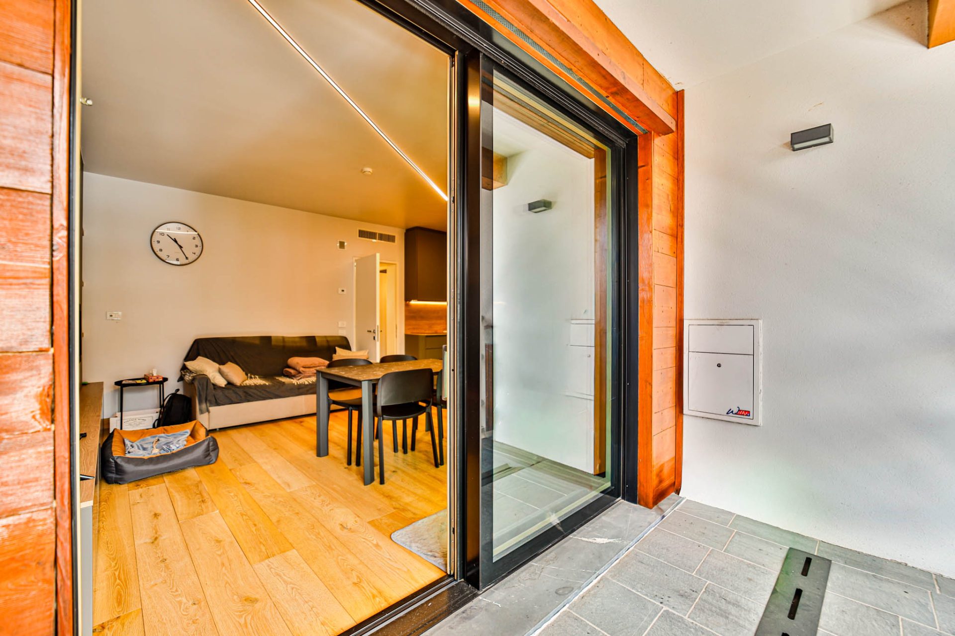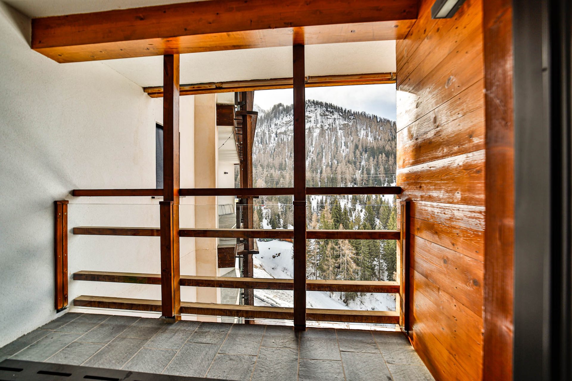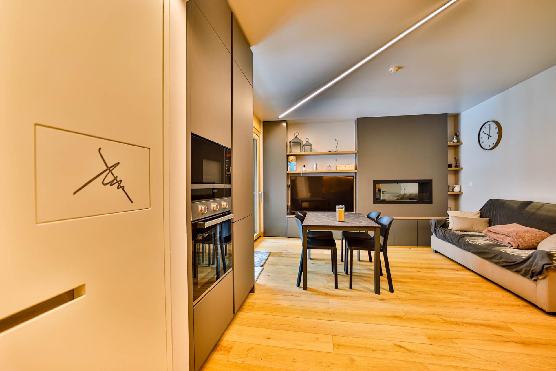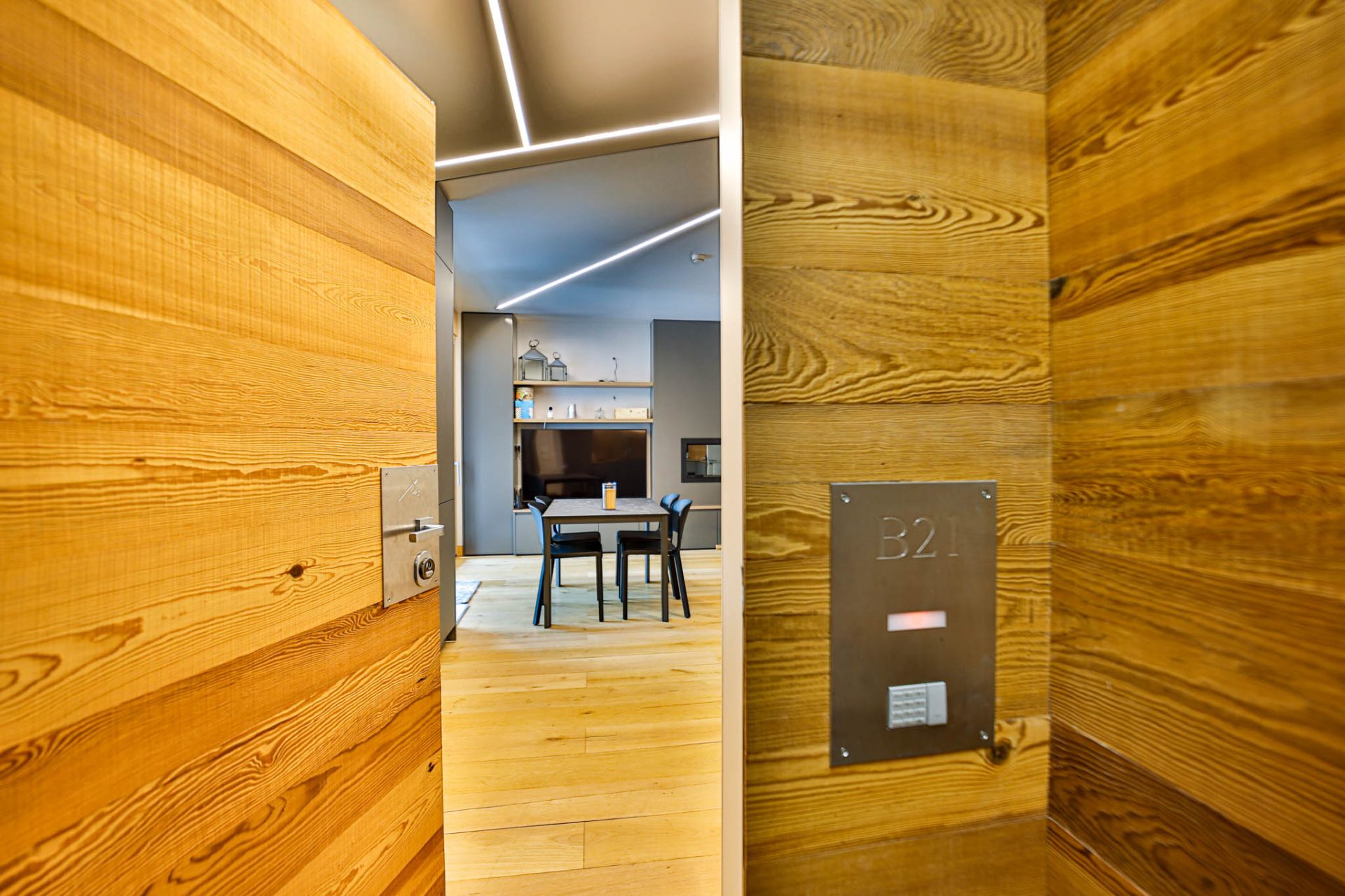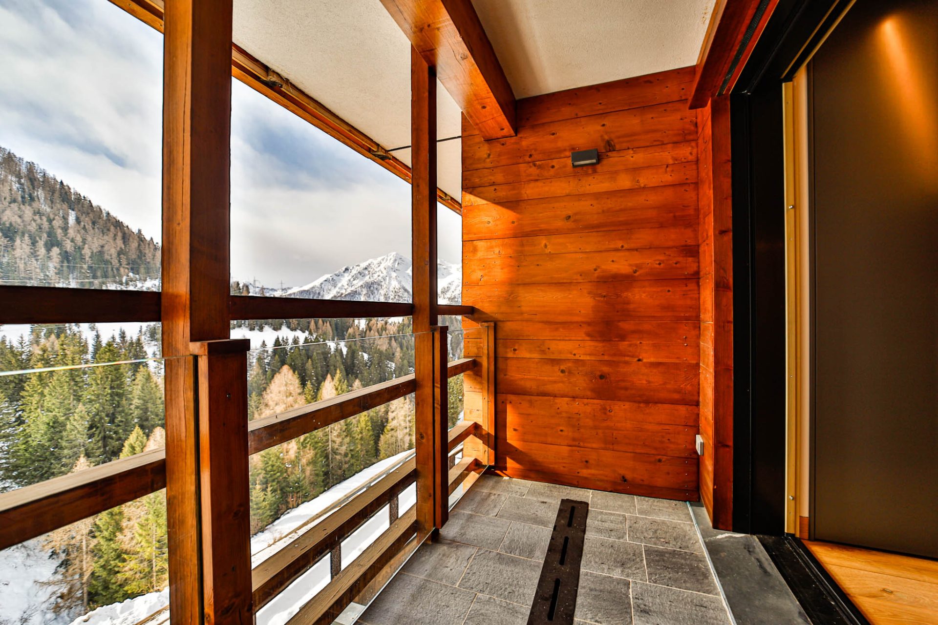 L’ingresso conduce a un’ampia zona giorno con cucina a vista e accesso al terrazzo panoramico con vista montagne: uno spazio luminoso e conviviale, perfetto dopo una giornata sugli sci.