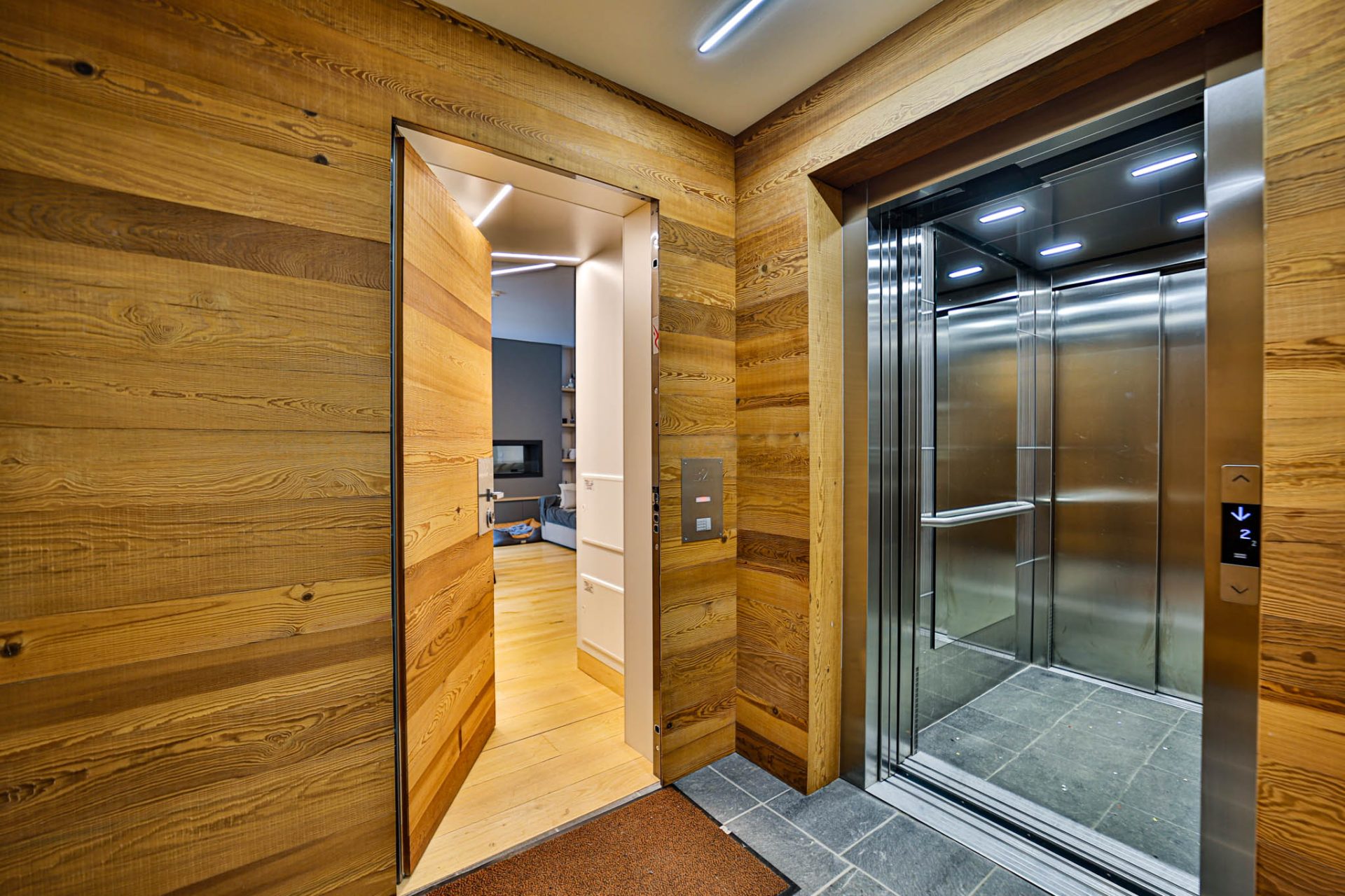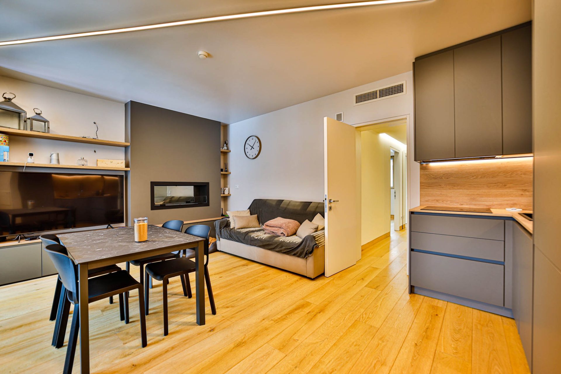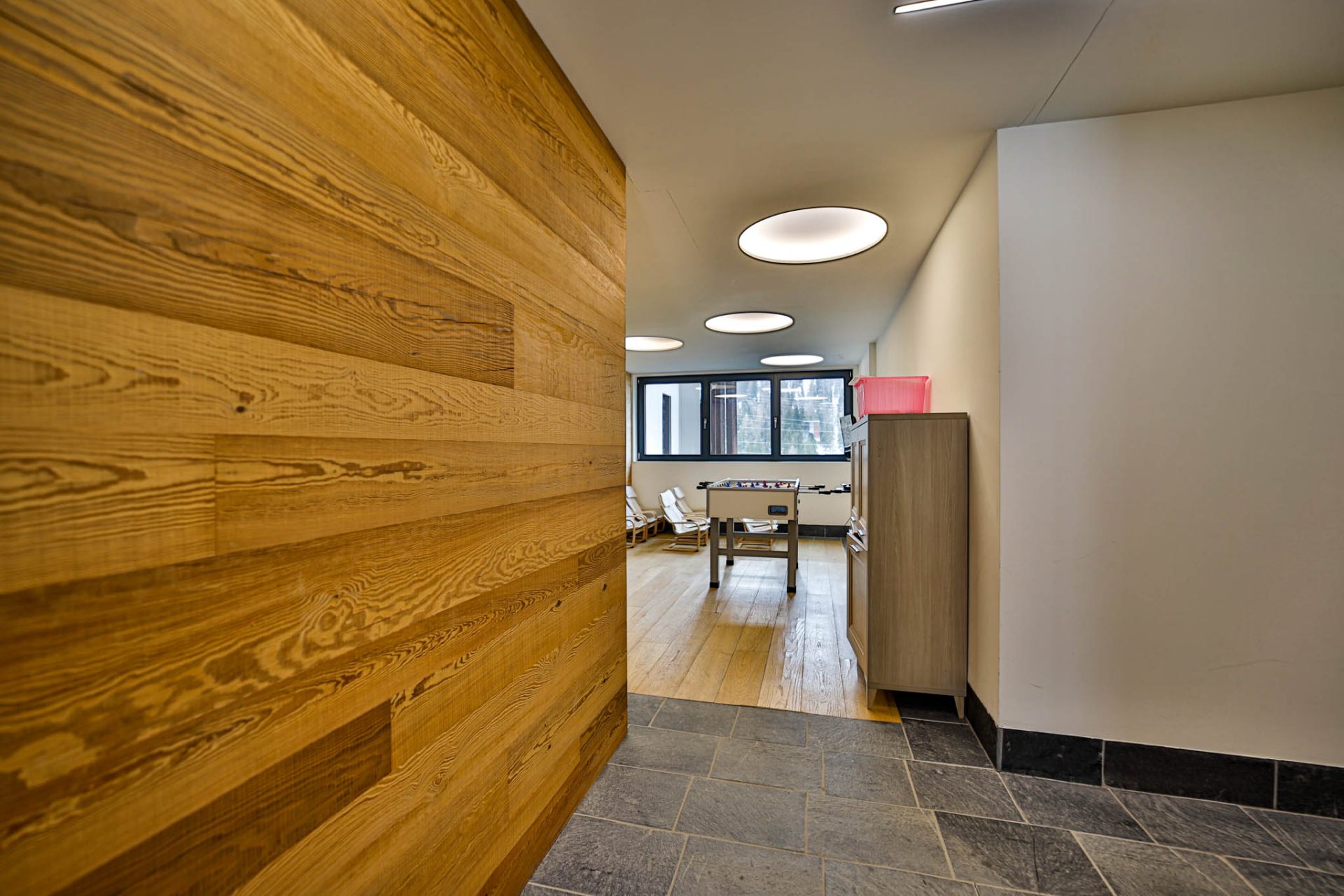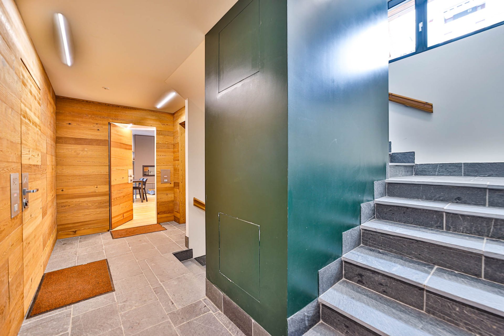 L’ingresso conduce a un’ampia zona giorno con cucina a vista e accesso al terrazzo panoramico con vista montagne: uno spazio luminoso e conviviale, perfetto dopo una giornata sugli sci.