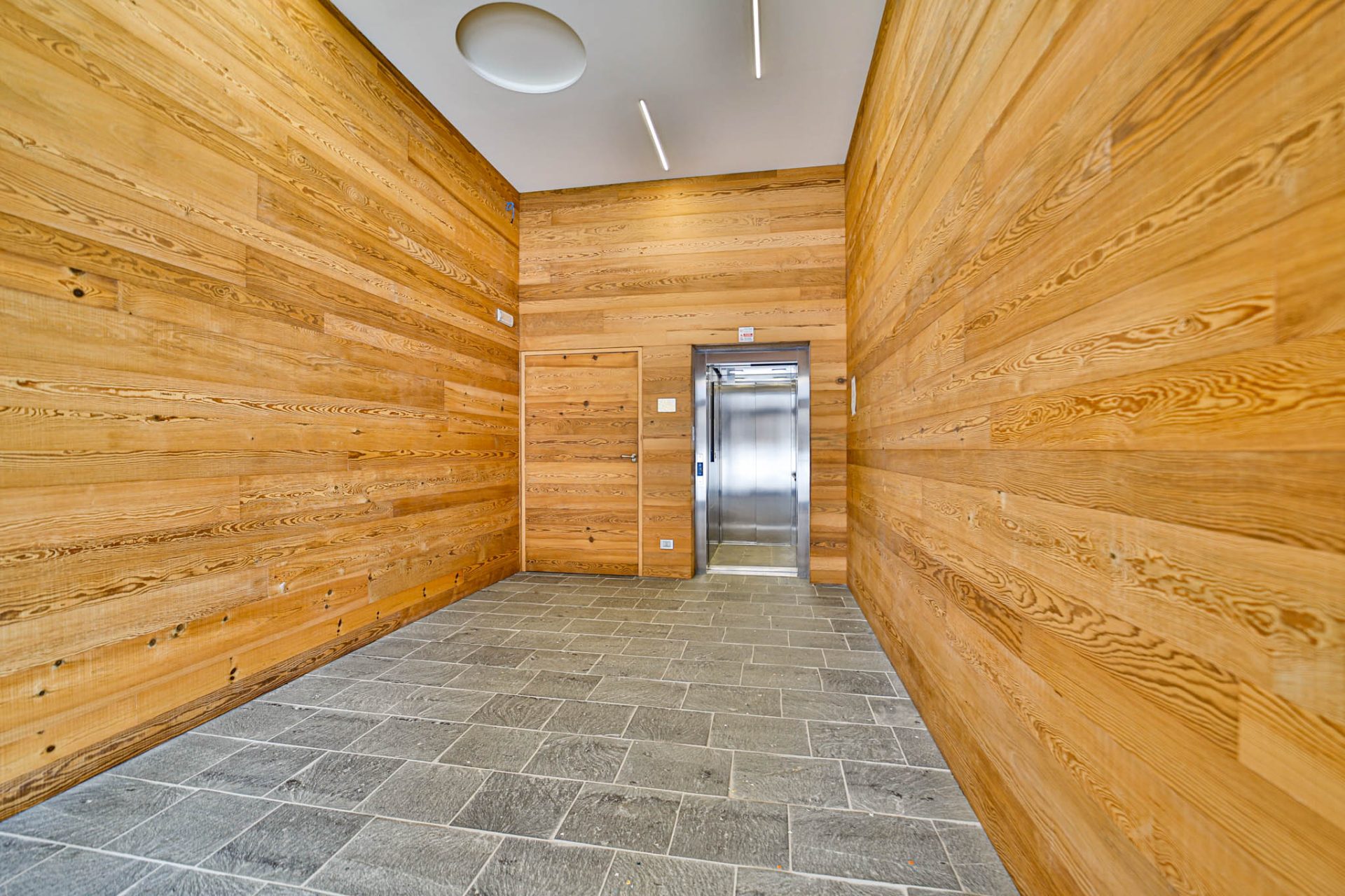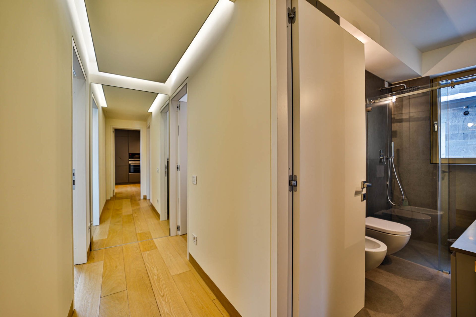L’intera abitazione è valorizzata da parquet a correre in grandi listoni in tutti gli ambienti, ad eccezione dei due bagni, rivestiti e pavimentati in raffinato effetto pietra.
