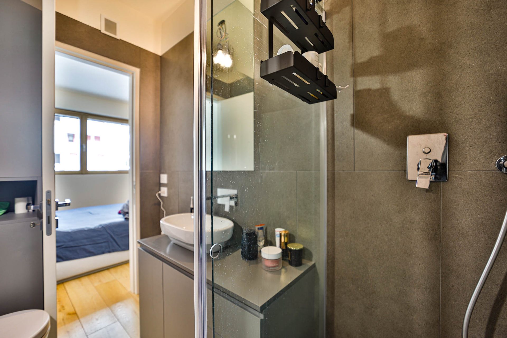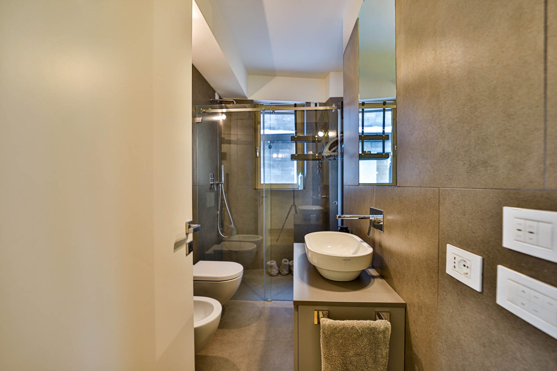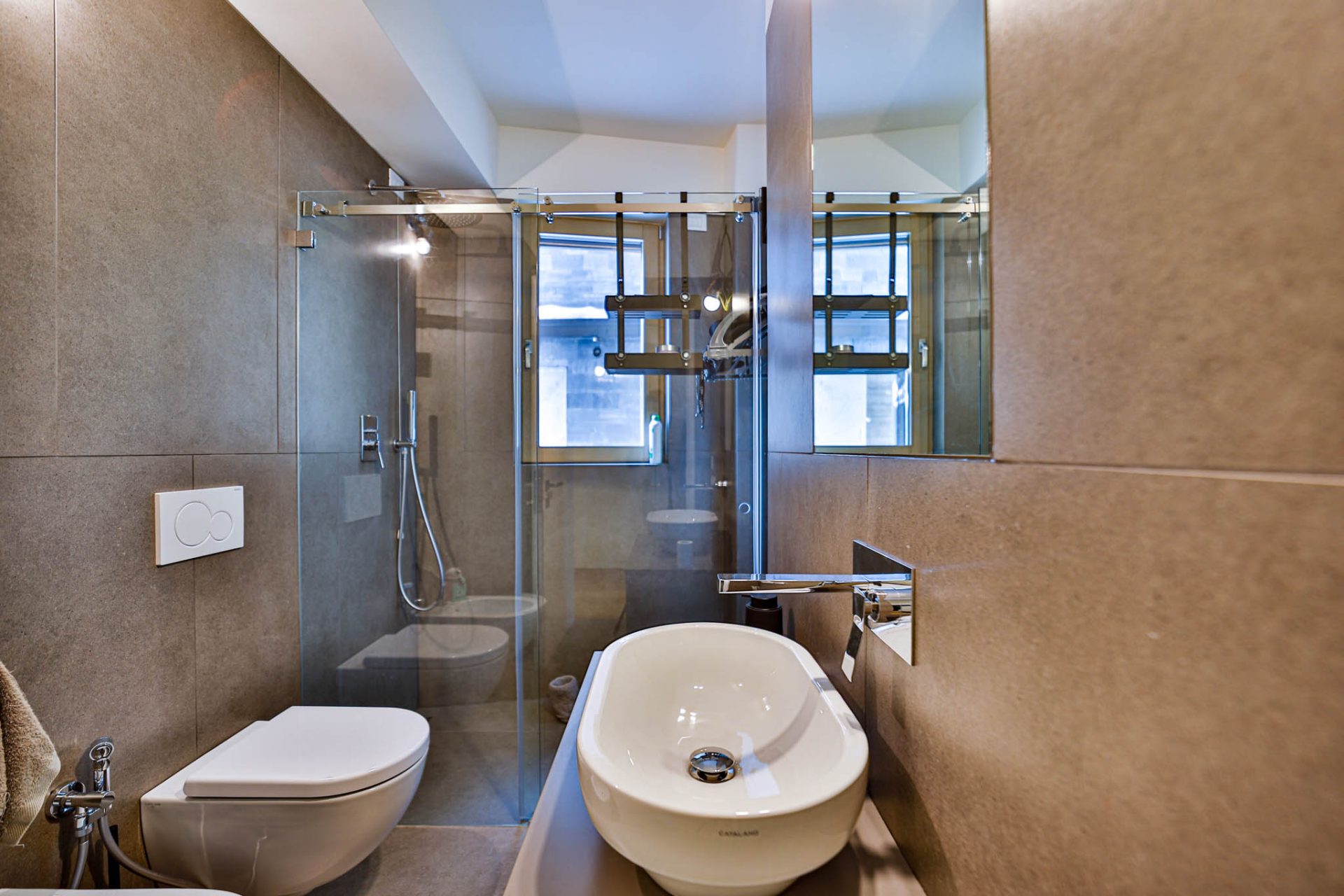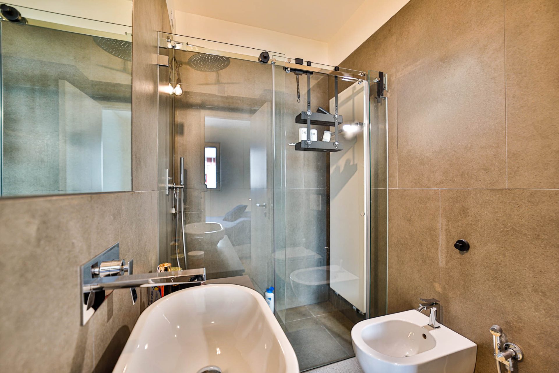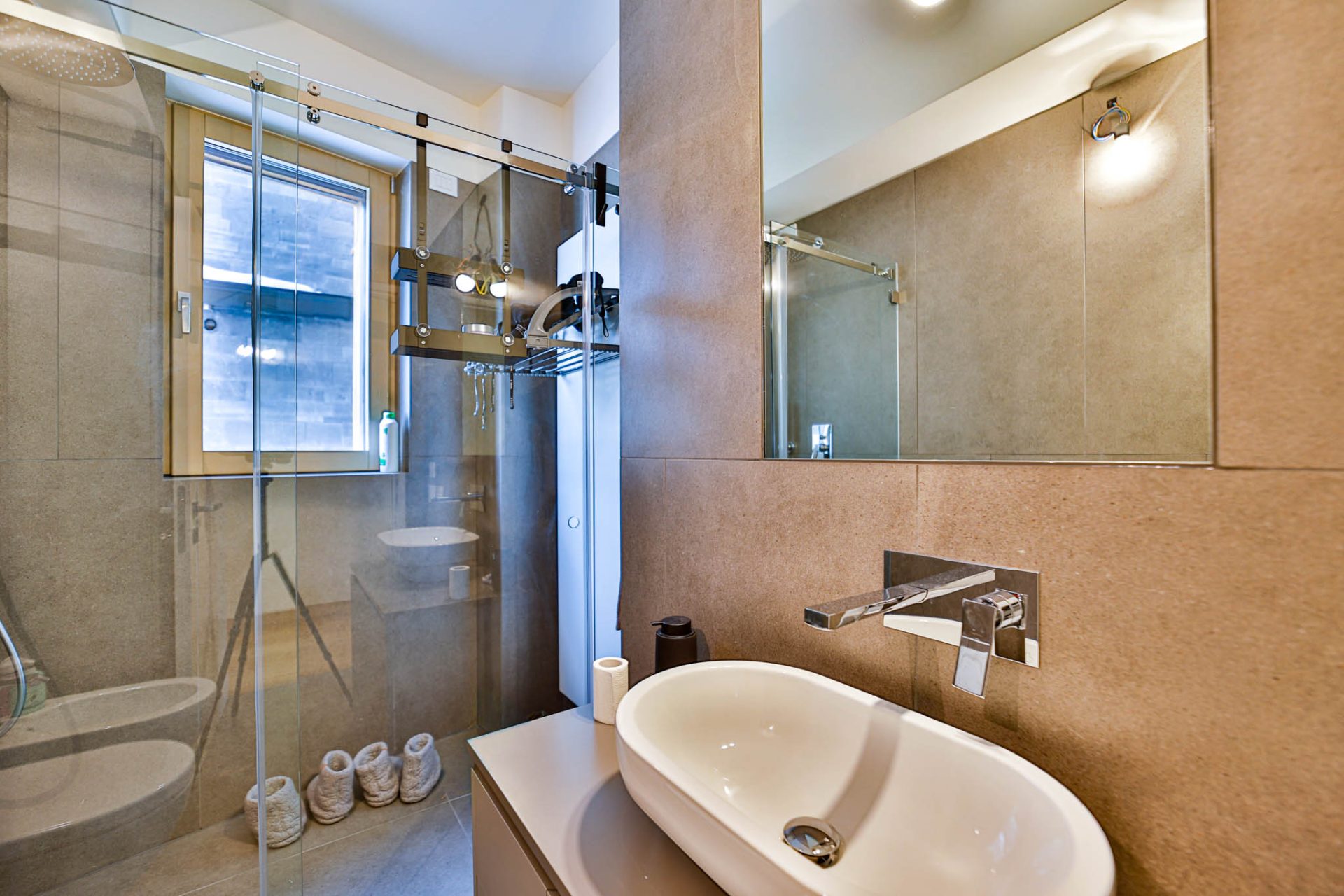 Bagno finestrato con doccia, rifinito in elegante effetto pietra