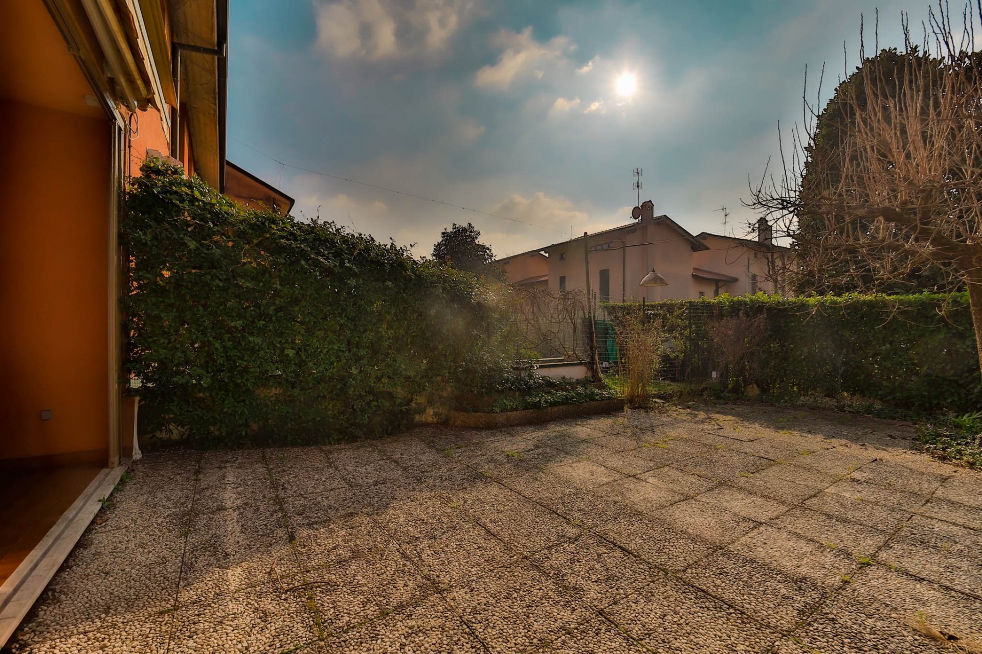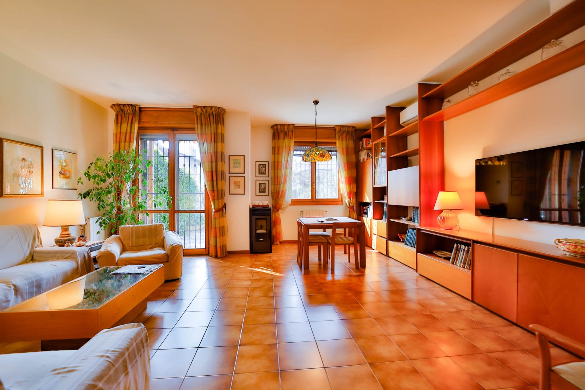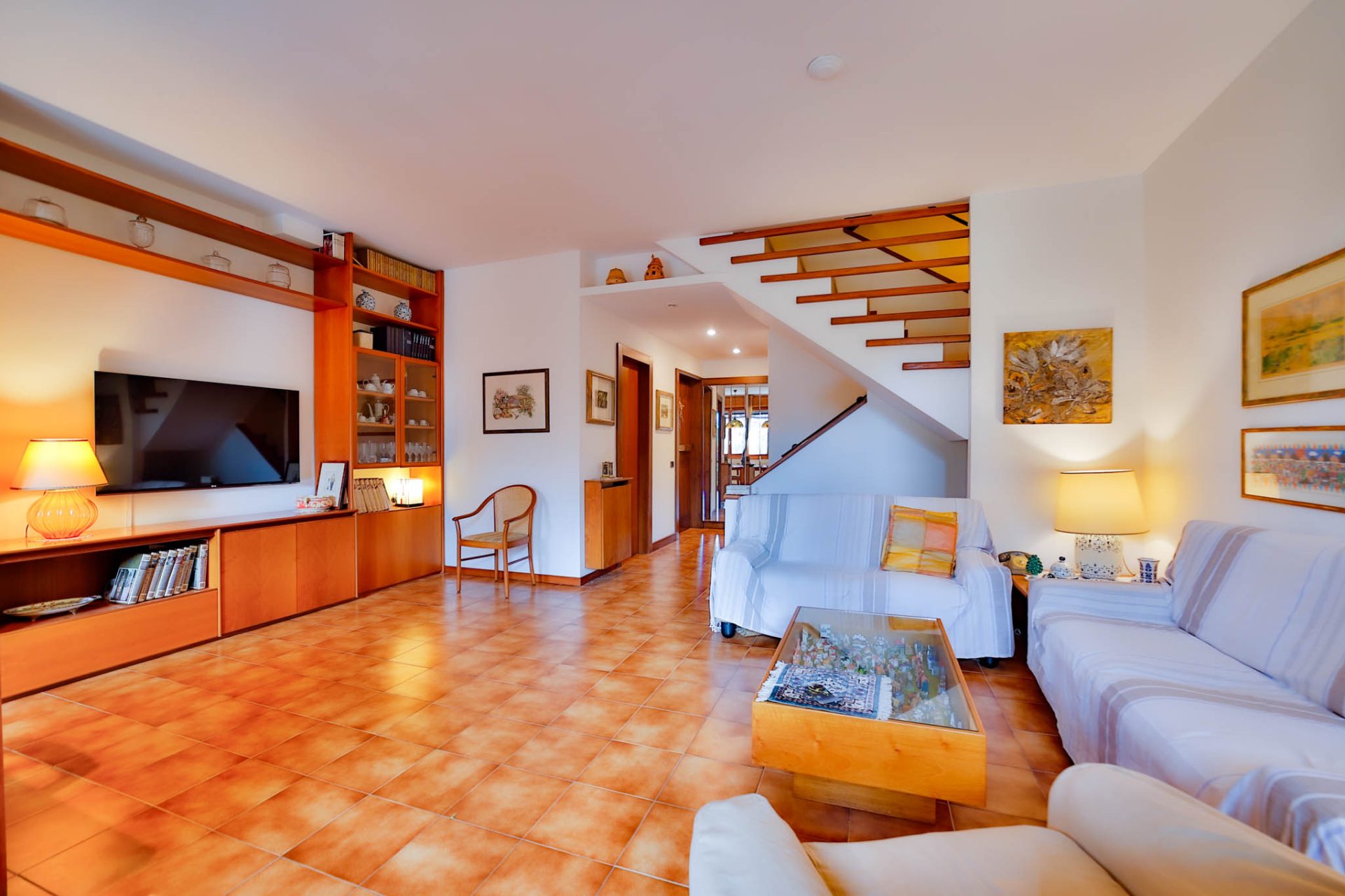 Il soggiorno, esposto ad ovest, si apre con le sue finestre sul portico e sul giardino privato di complessivi 100 mq c.a. la luce del tramonto entra calda e avvolgente, creando un’atmosfera intima e rilassante. Il portico diventa naturale estensione della zona living durante la bella stagione grazie anche al tendone da sole motorizzato.