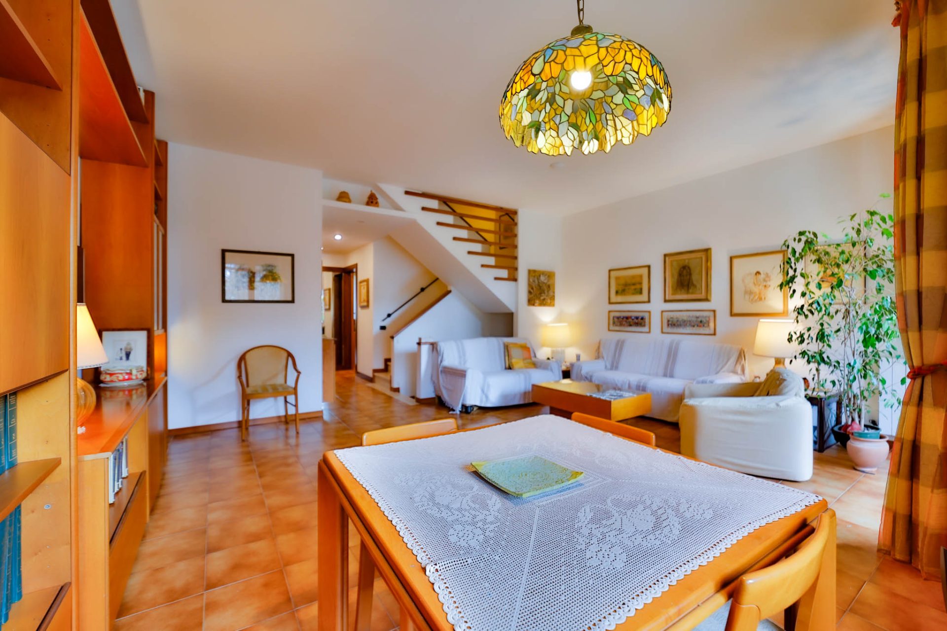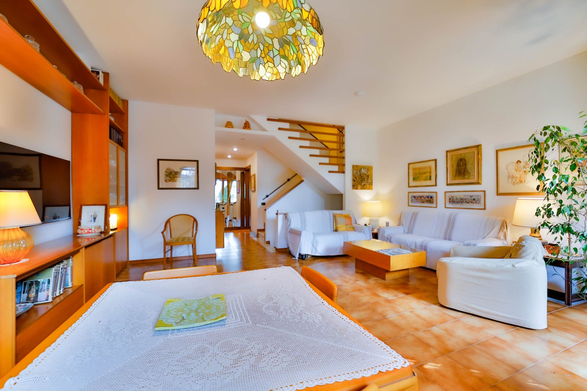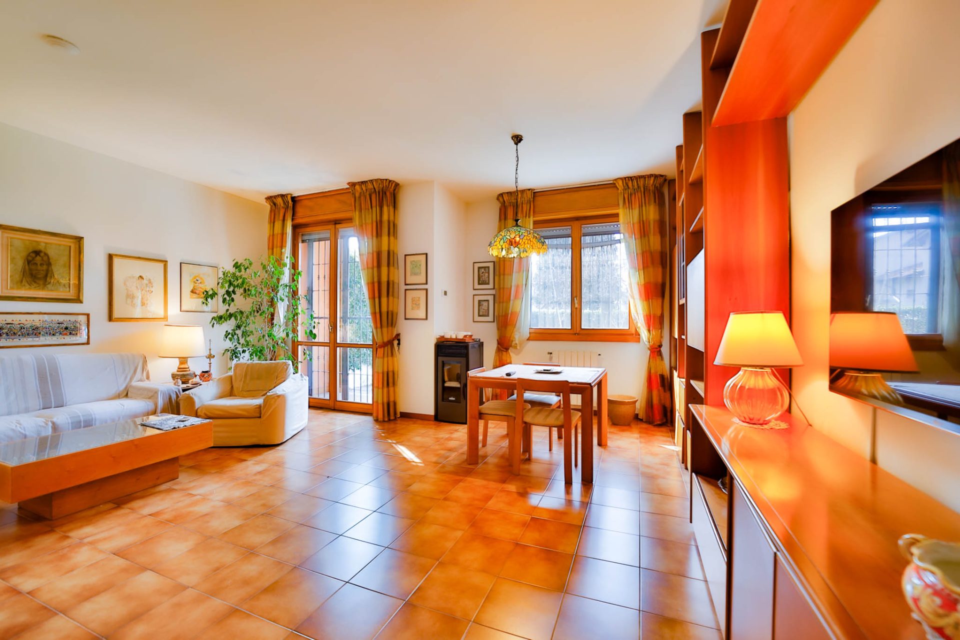 Il soggiorno, esposto ad ovest, si apre con le sue finestre sul portico e sul giardino privato di complessivi 100 mq c.a. la luce del tramonto entra calda e avvolgente, creando un’atmosfera intima e rilassante. Il portico diventa naturale estensione della zona living durante la bella stagione grazie anche al tendone da sole motorizzato.