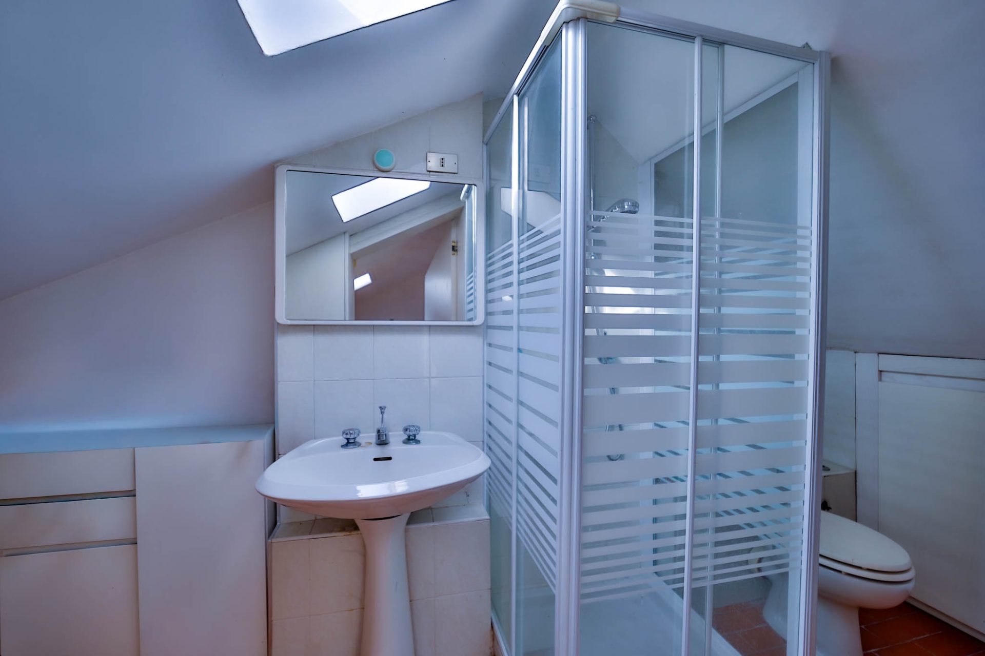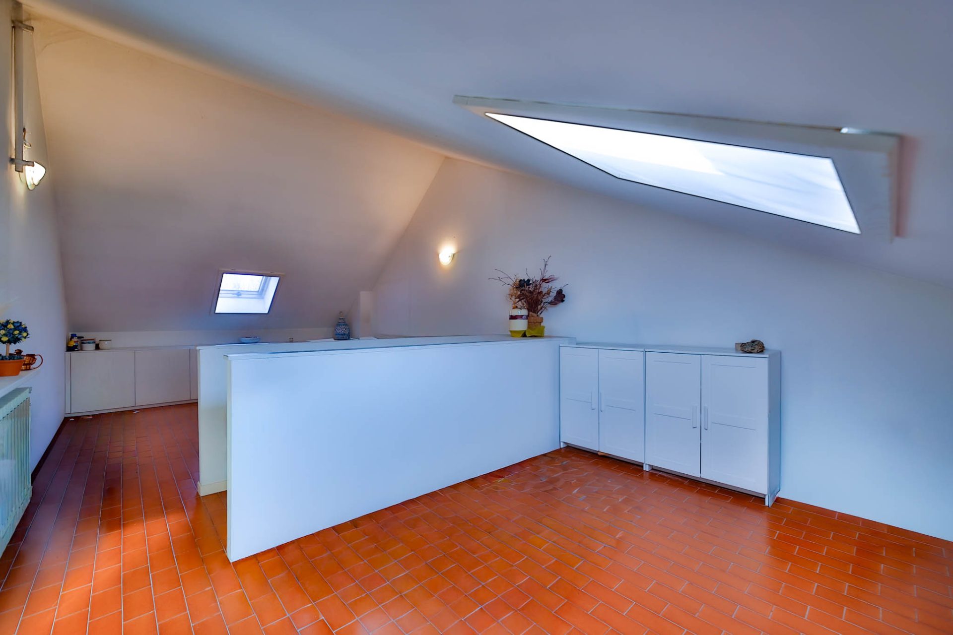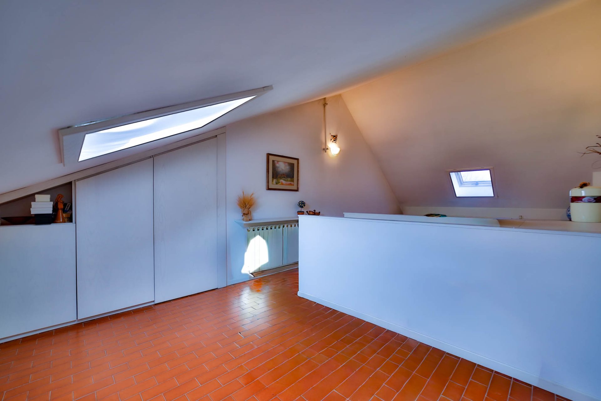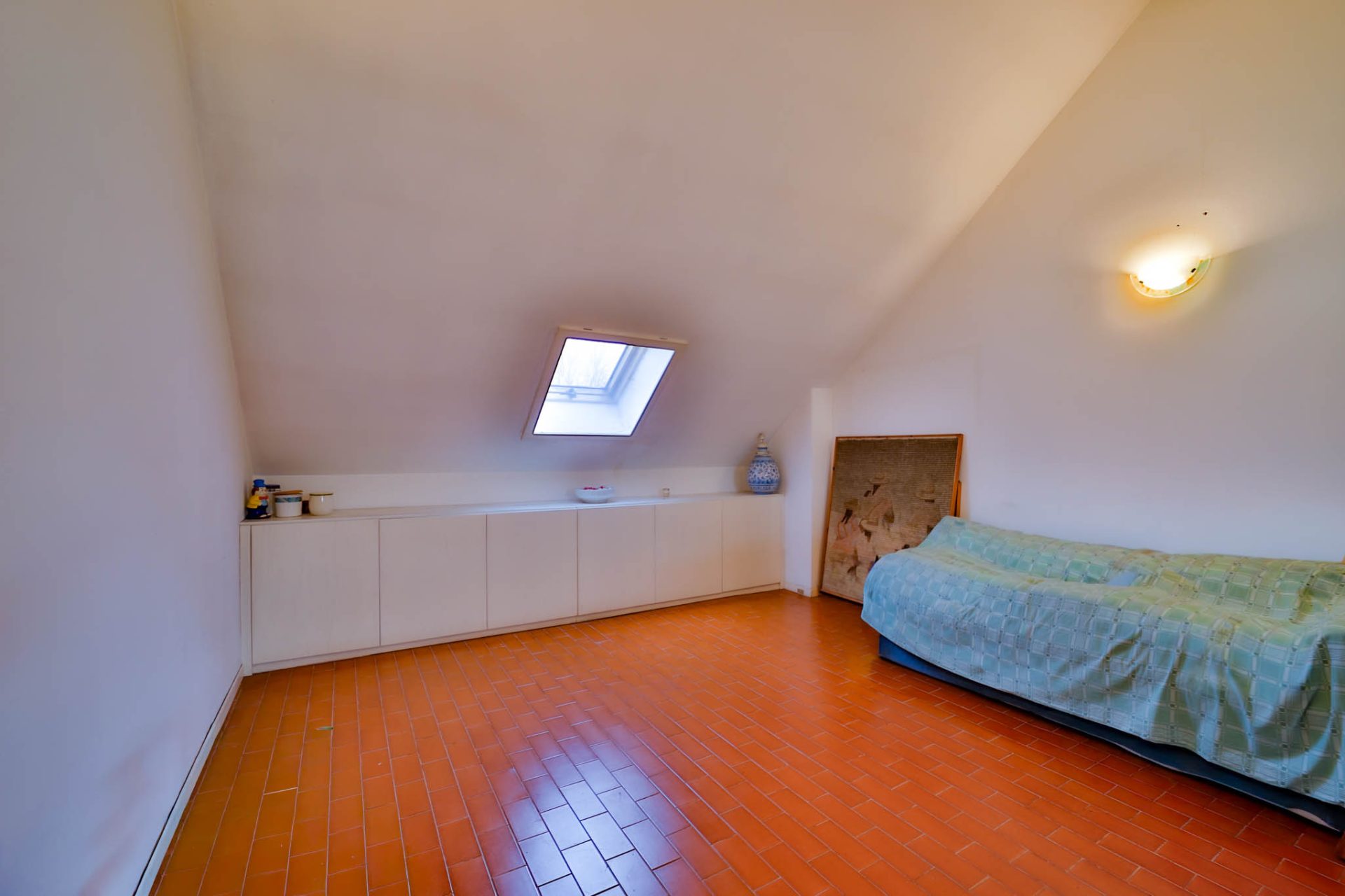 Il piano mansardato oggi si presenta come un unico grande ambiente, oltre bagno di servizio.