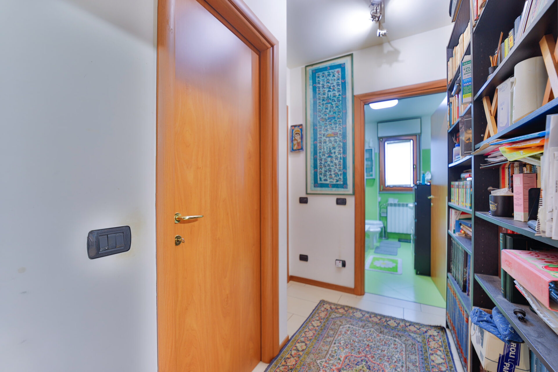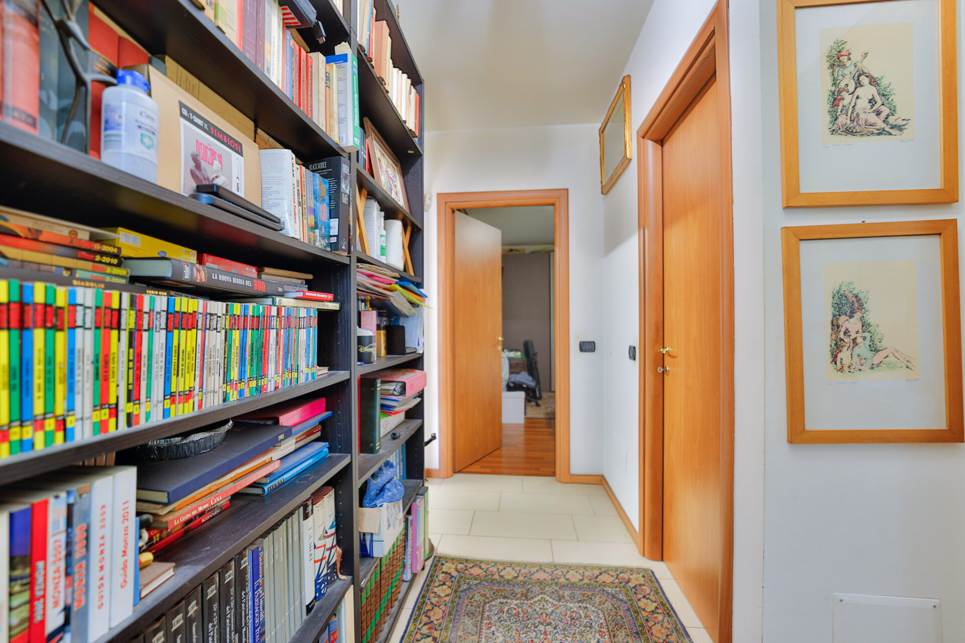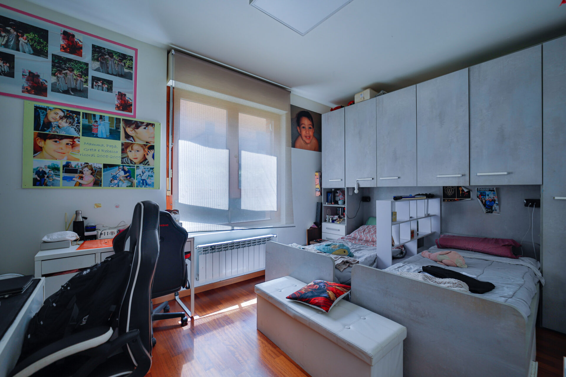 La zona notte è ben distribuita, con due camere matrimoniali, due bagni finestrati e comodo disimpegno.