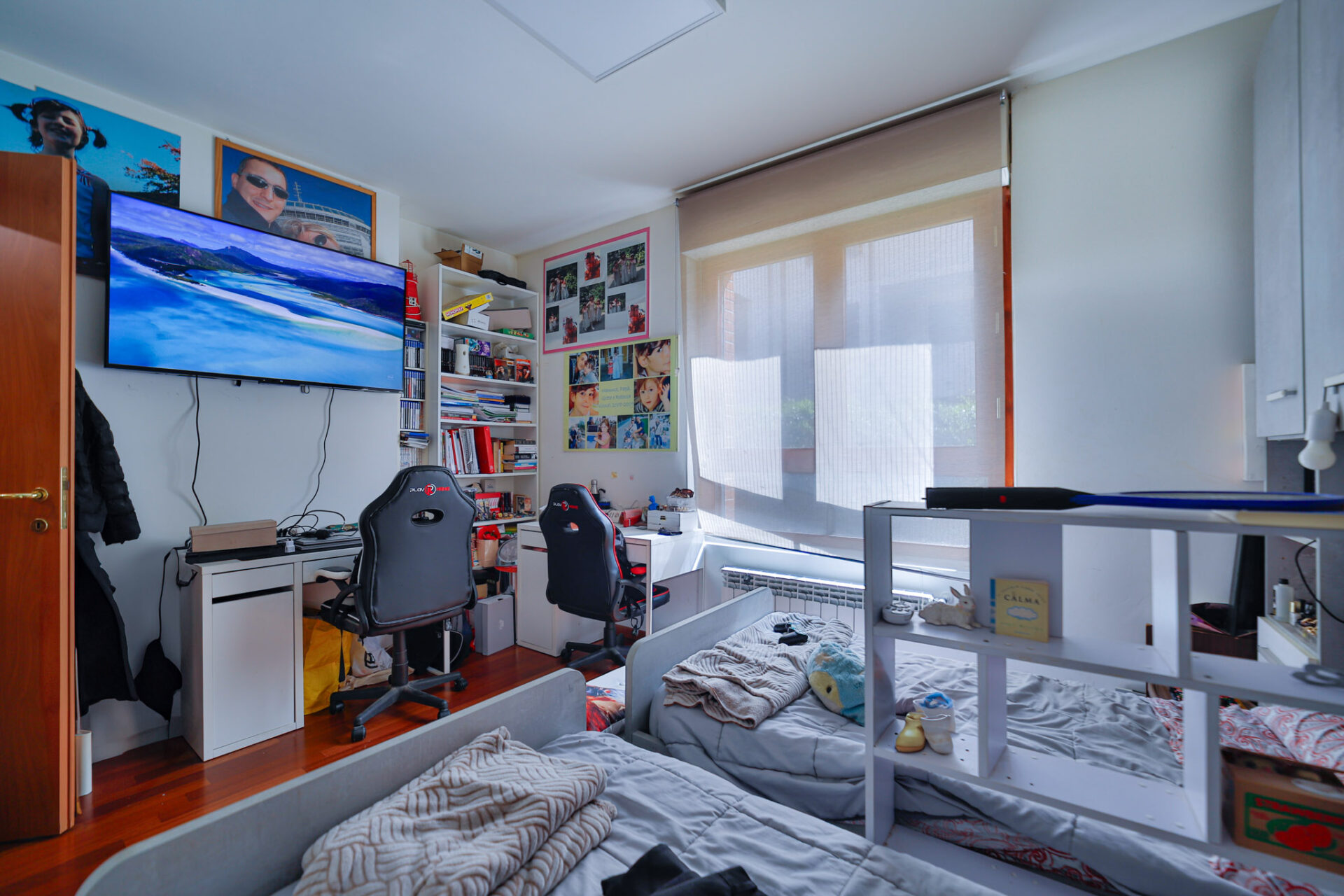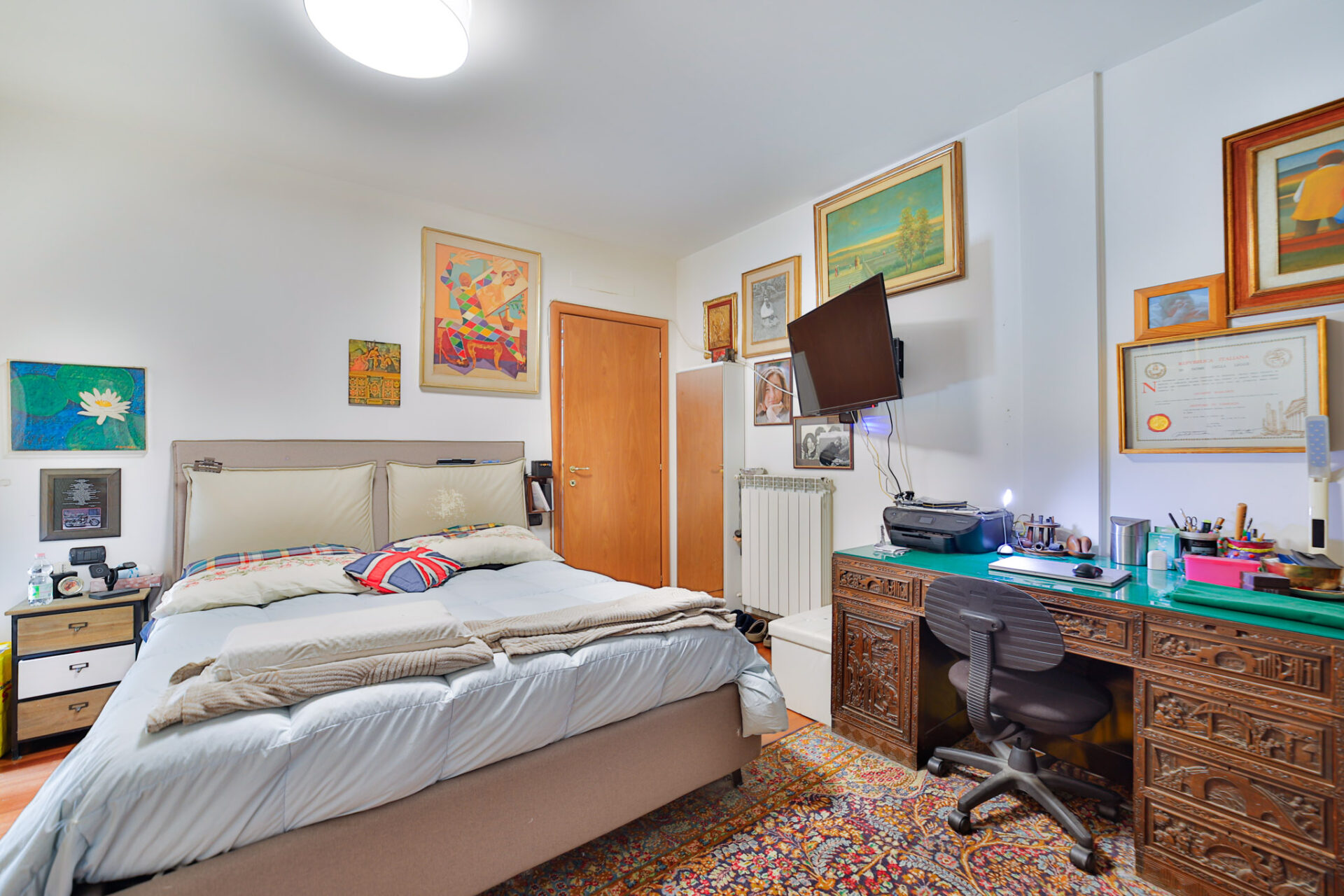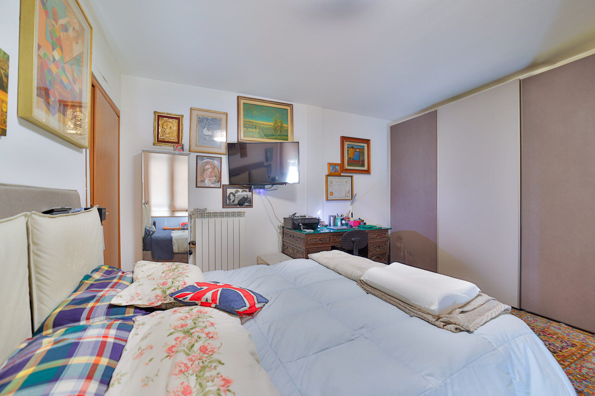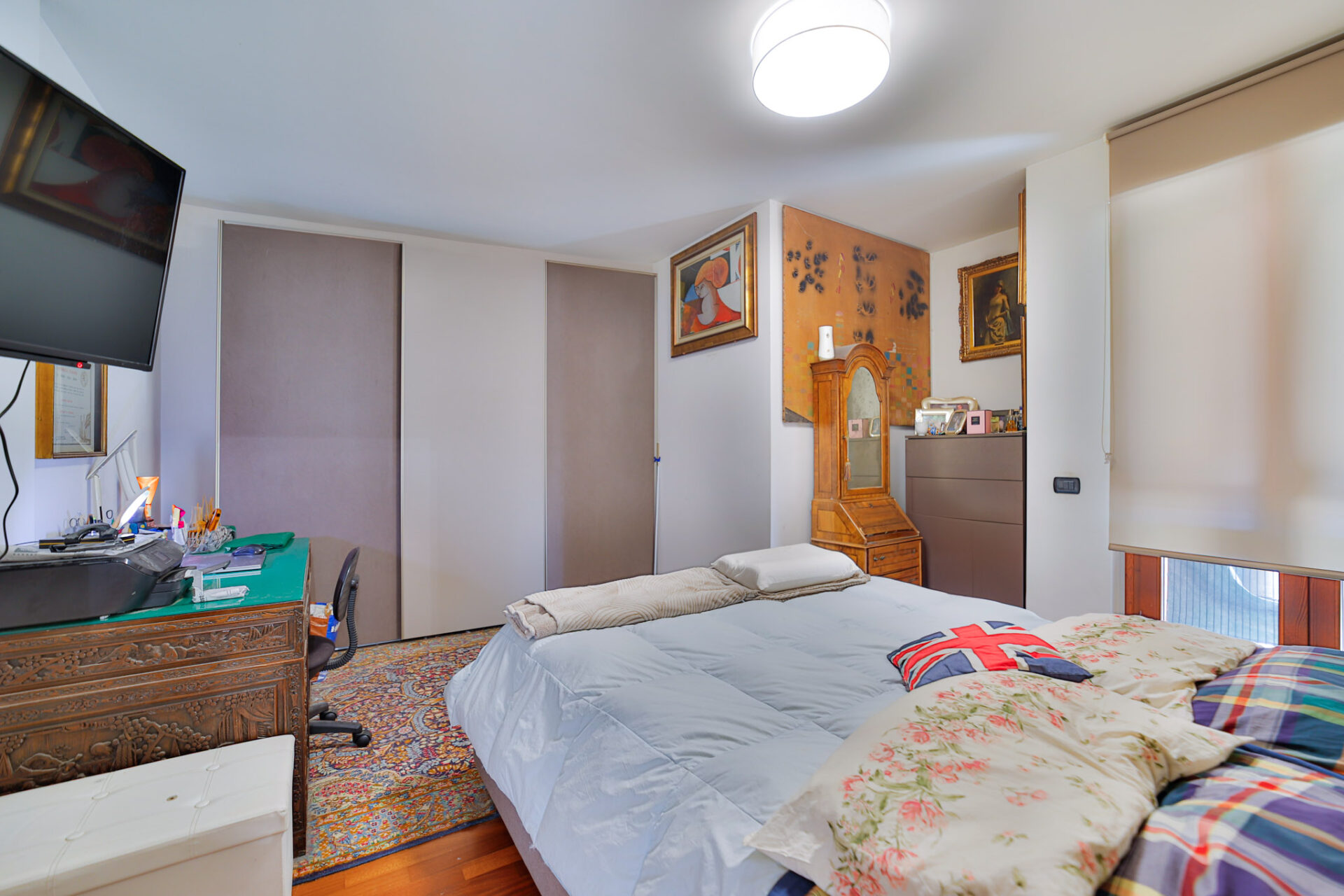 La zona notte è ben distribuita, con due camere matrimoniali, due bagni finestrati e comodo disimpegno.