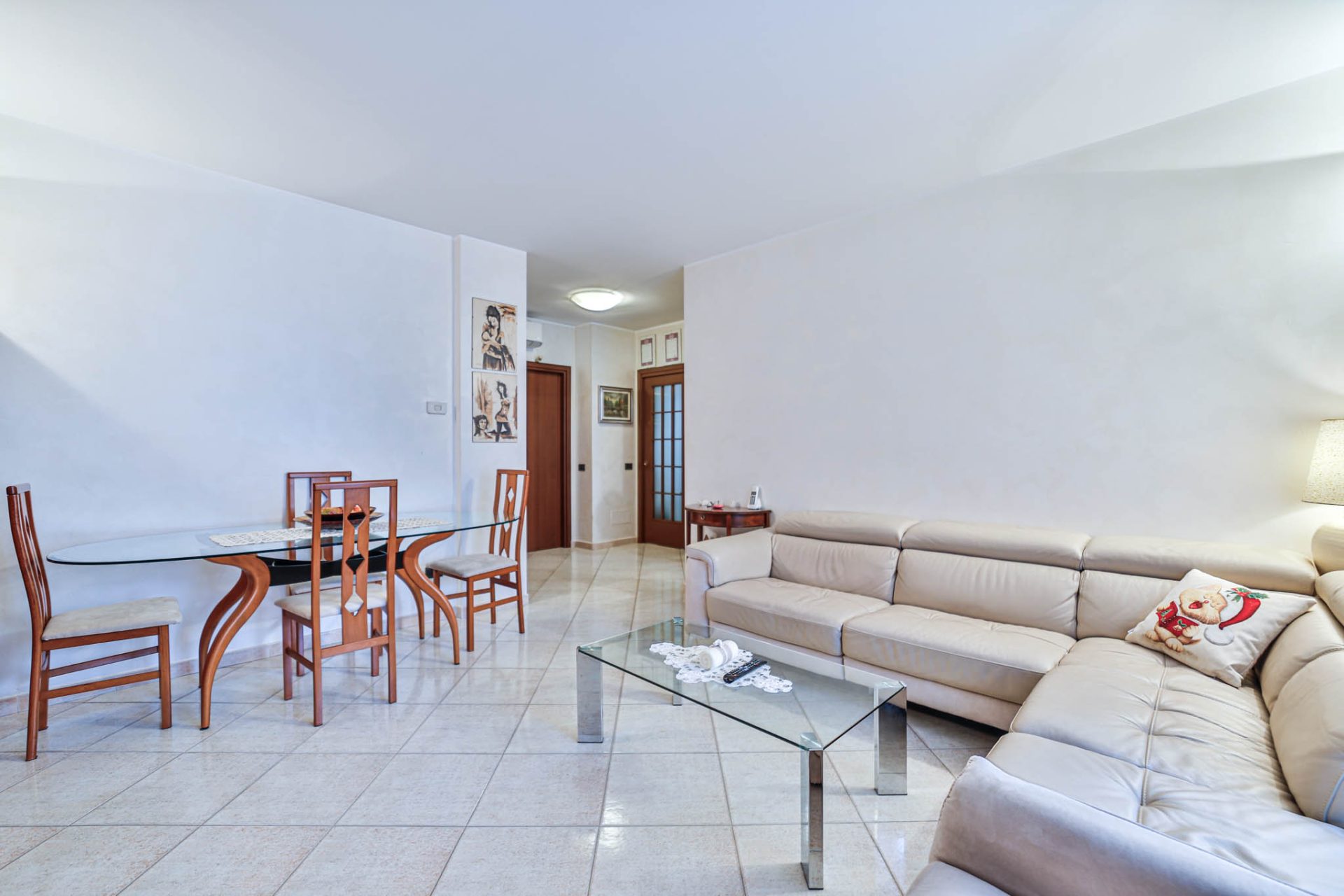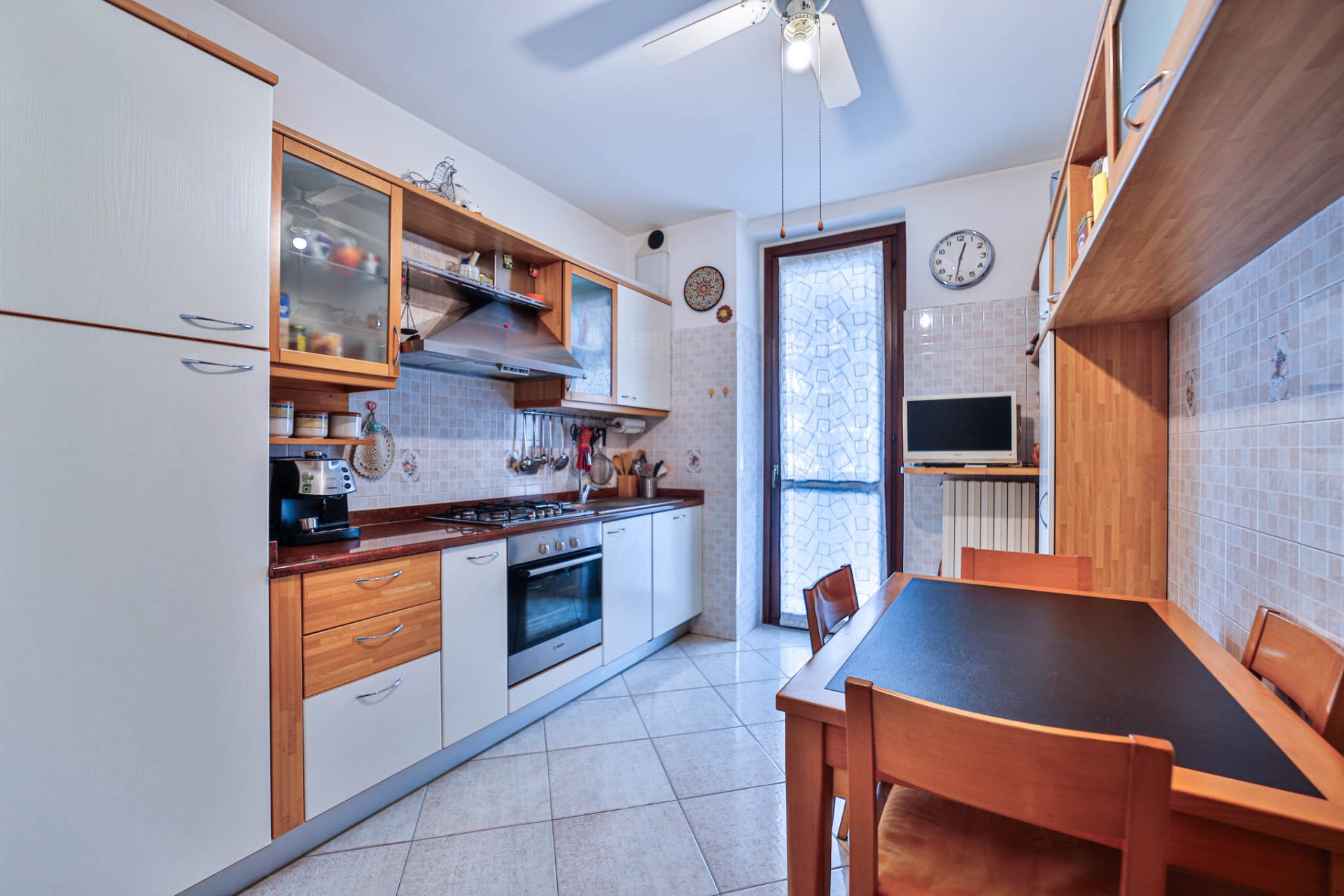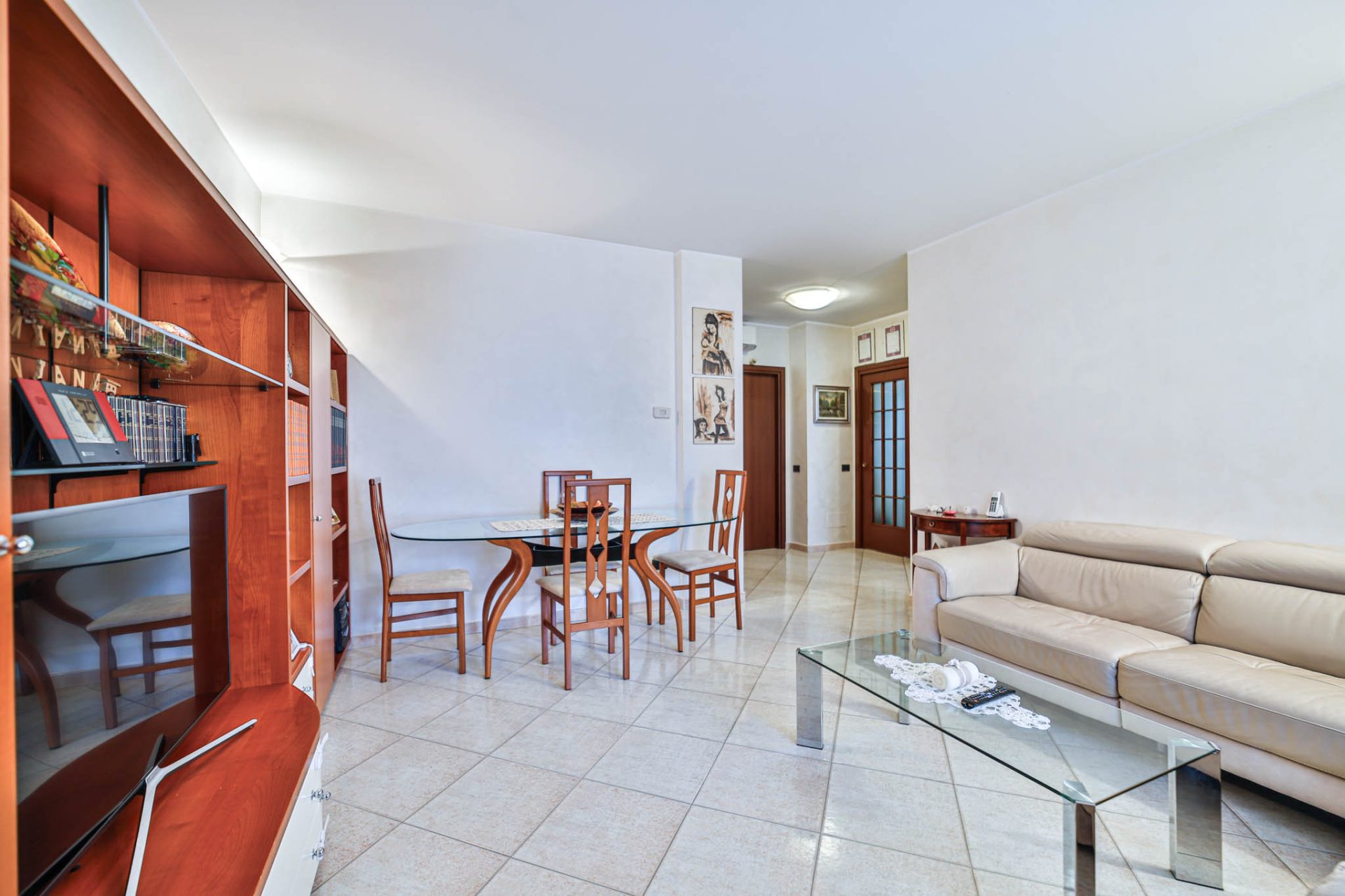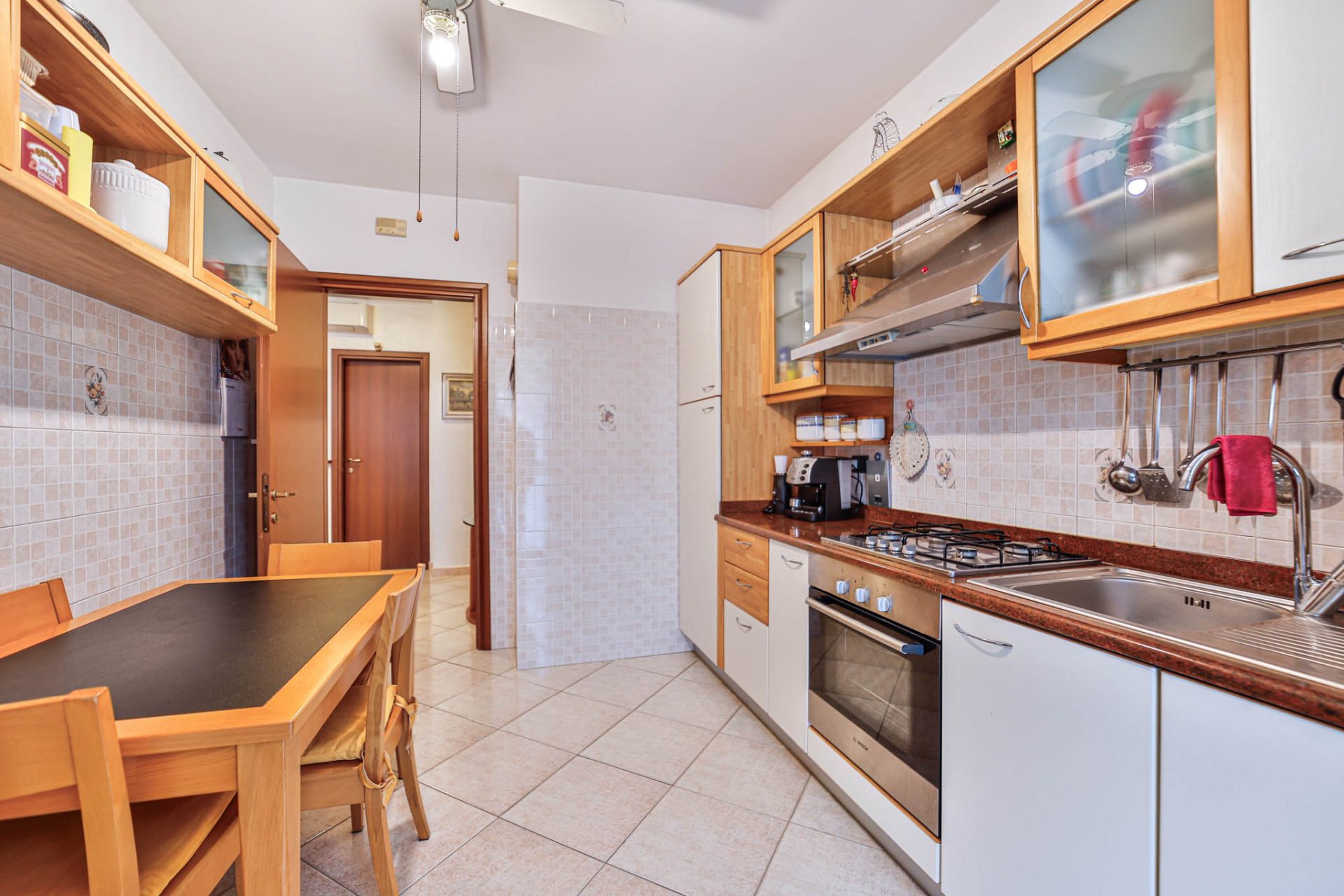 L’ingresso conduce a un ampio soggiorno, luminoso e accogliente, con porta-finestra sul terrazzo, condiviso con la cucina abitabile, anch’essa dotata di uscita esterna e con piacevole affaccio sulla piazza interna, silenziosa e ordinata.